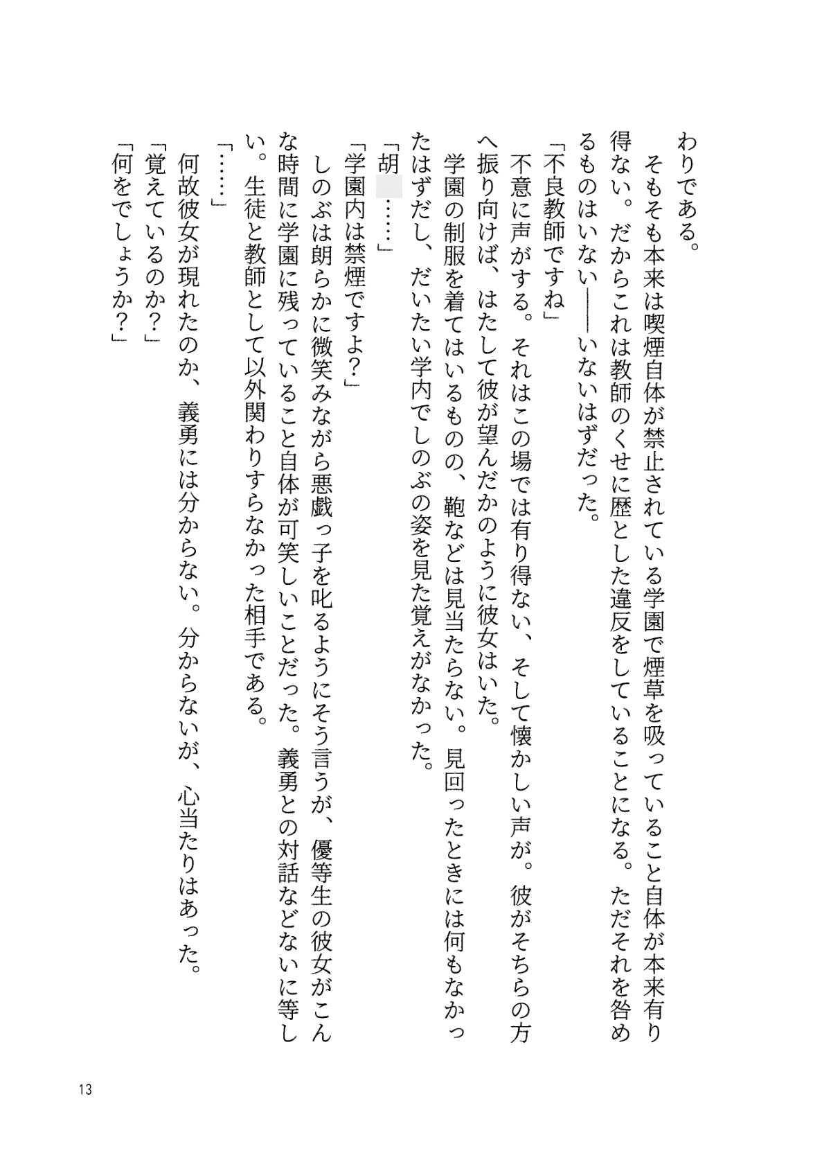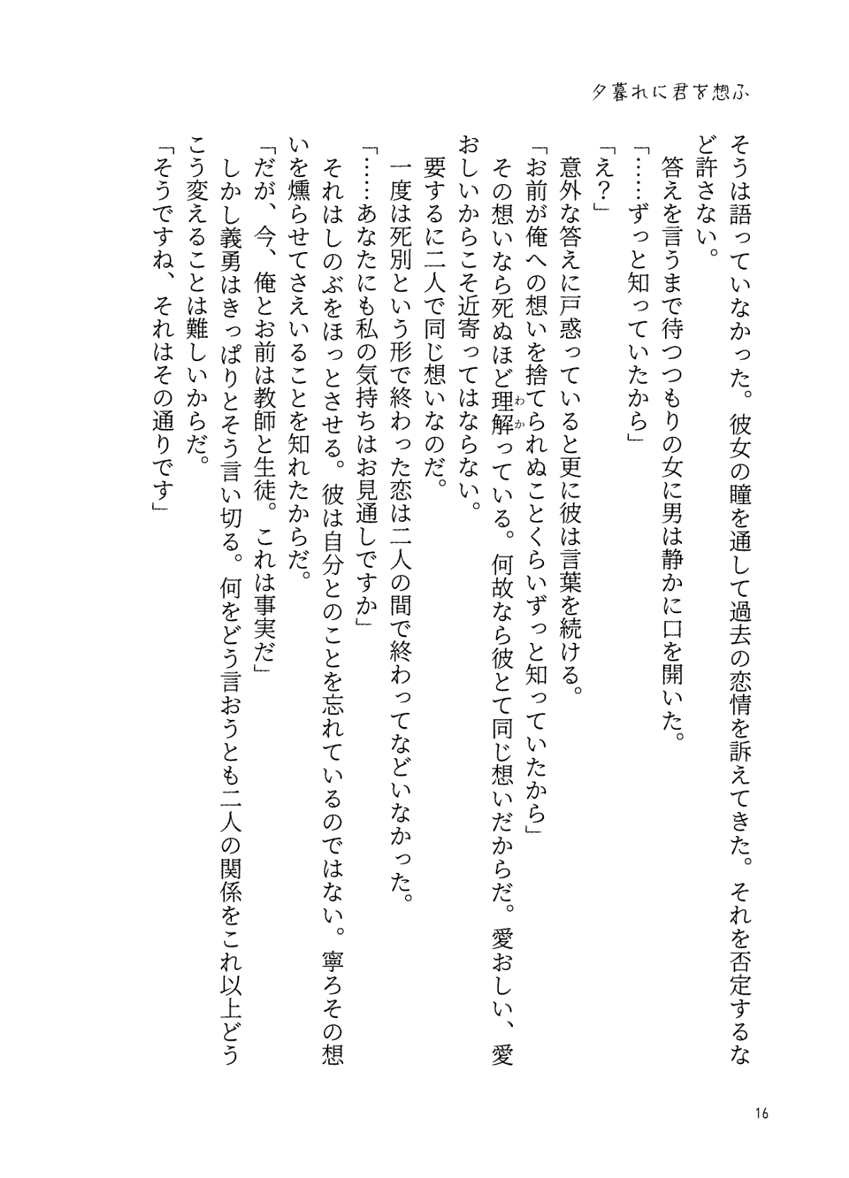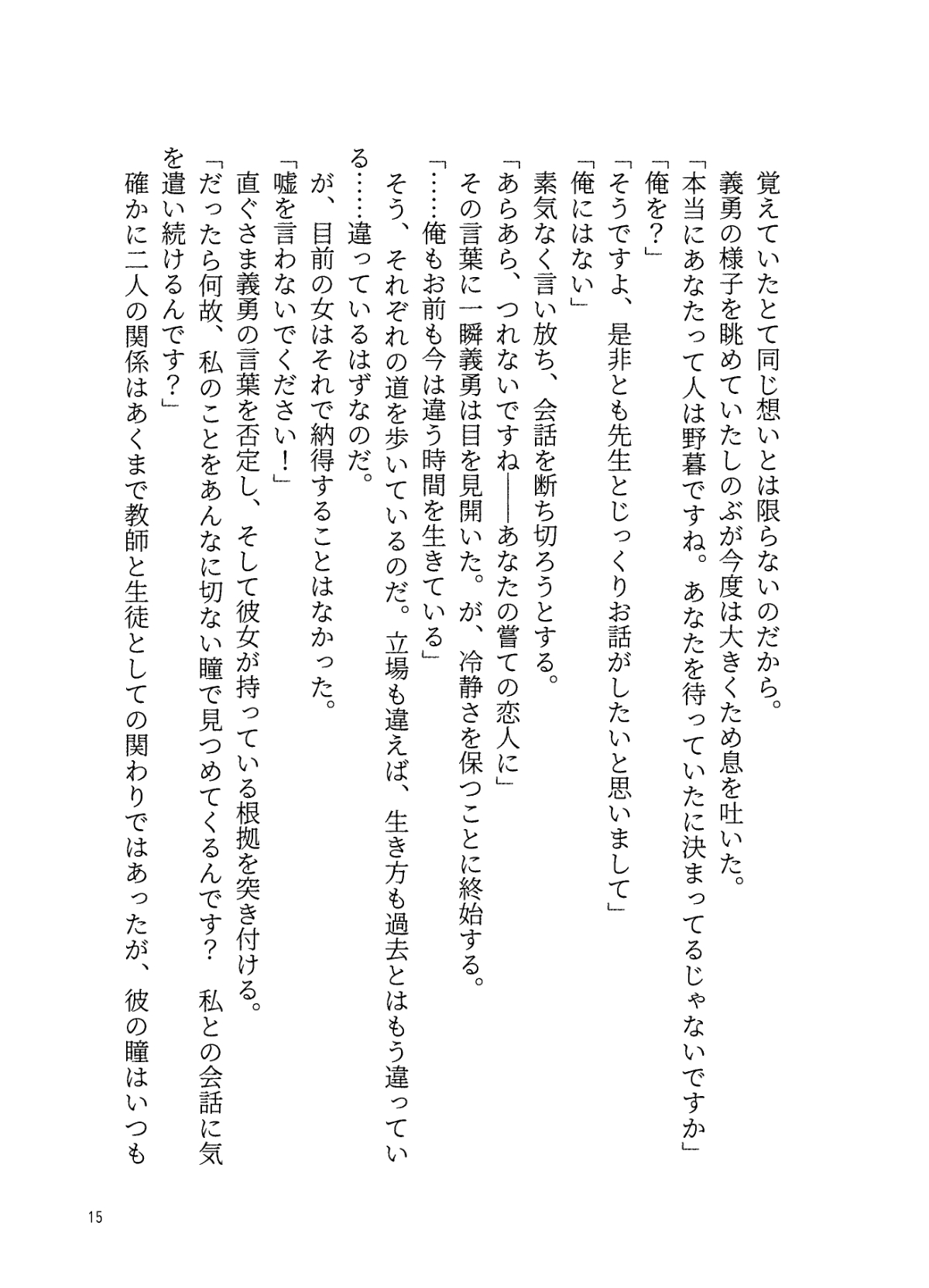 確かに二人の関係はあくまで教師と生徒としての関わりではあったが、彼の瞳はいつもそうは語っていなかった。彼女の瞳を通して過去の恋情を訴えてきた。それを否定するなど許さない。