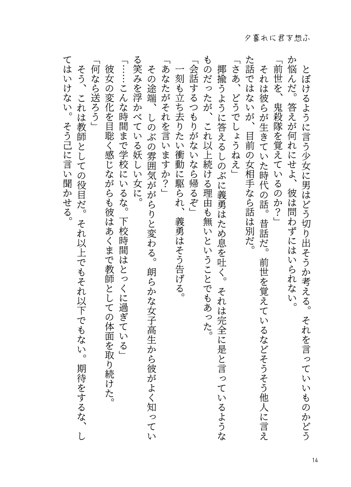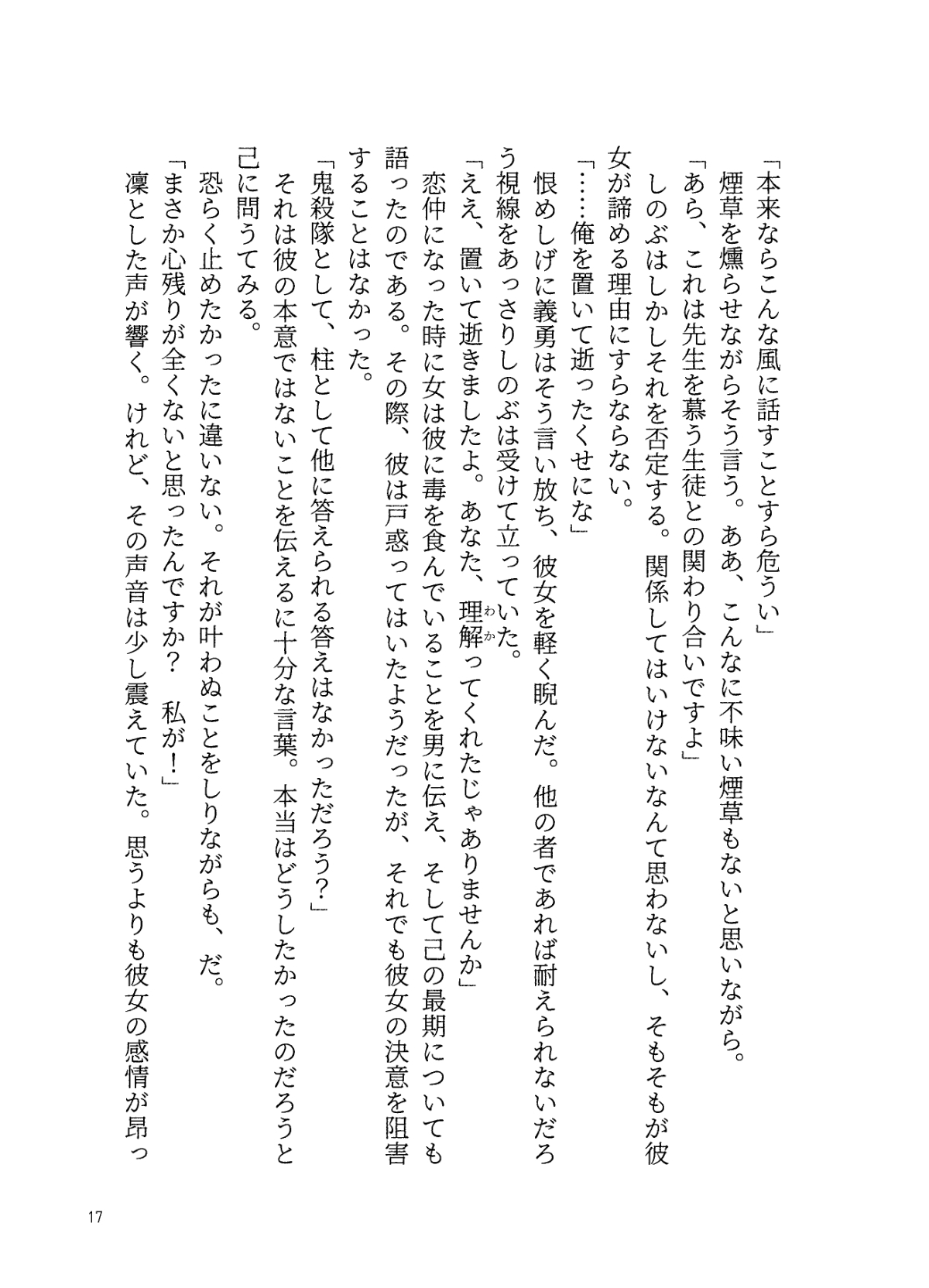 しのぶは朗らかに微笑みながら悪戯っ子を叱るようにそう言うが、優等生の彼女がこんな時間に学園に残っていること自体が可笑しいことだった。義勇との対話などないに等しい。生徒と教師として以外関わりすらなかった相手である。