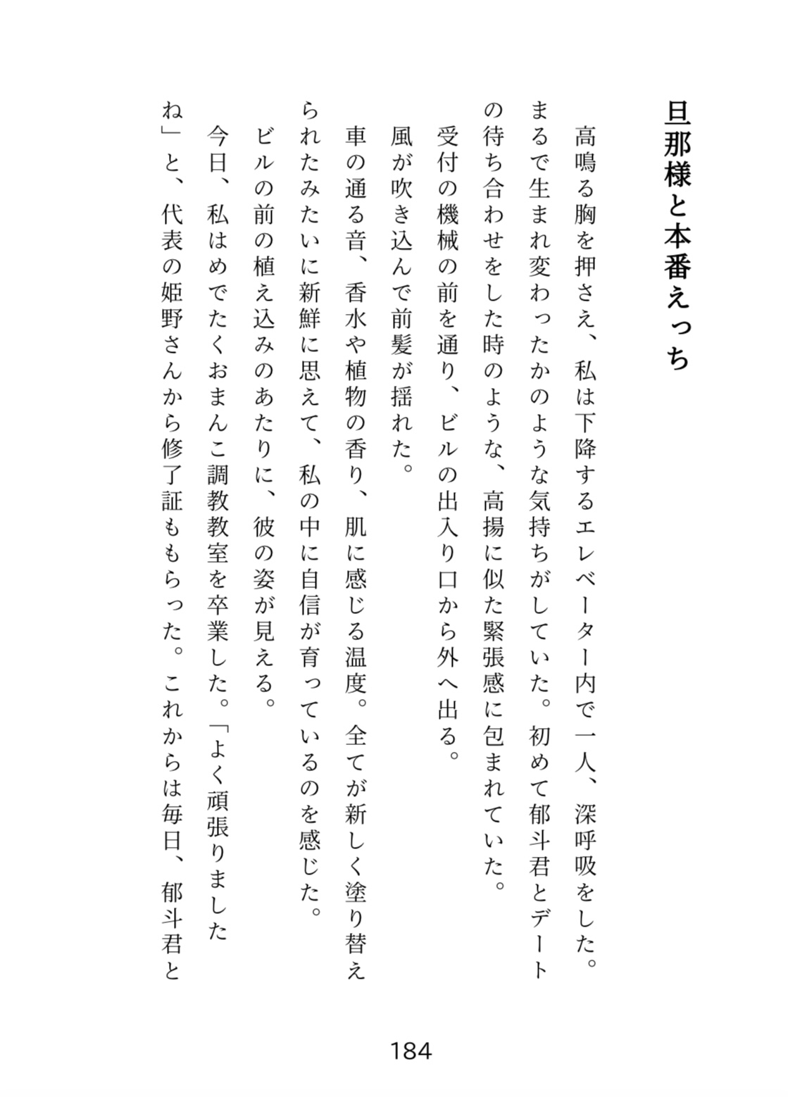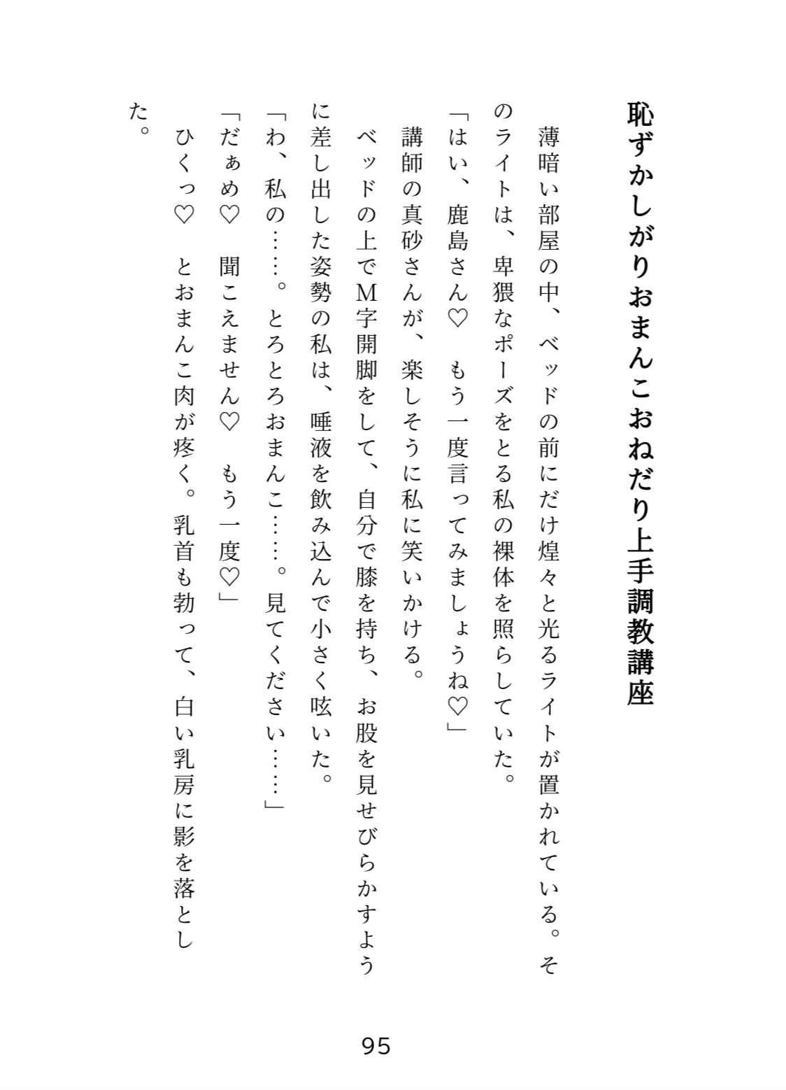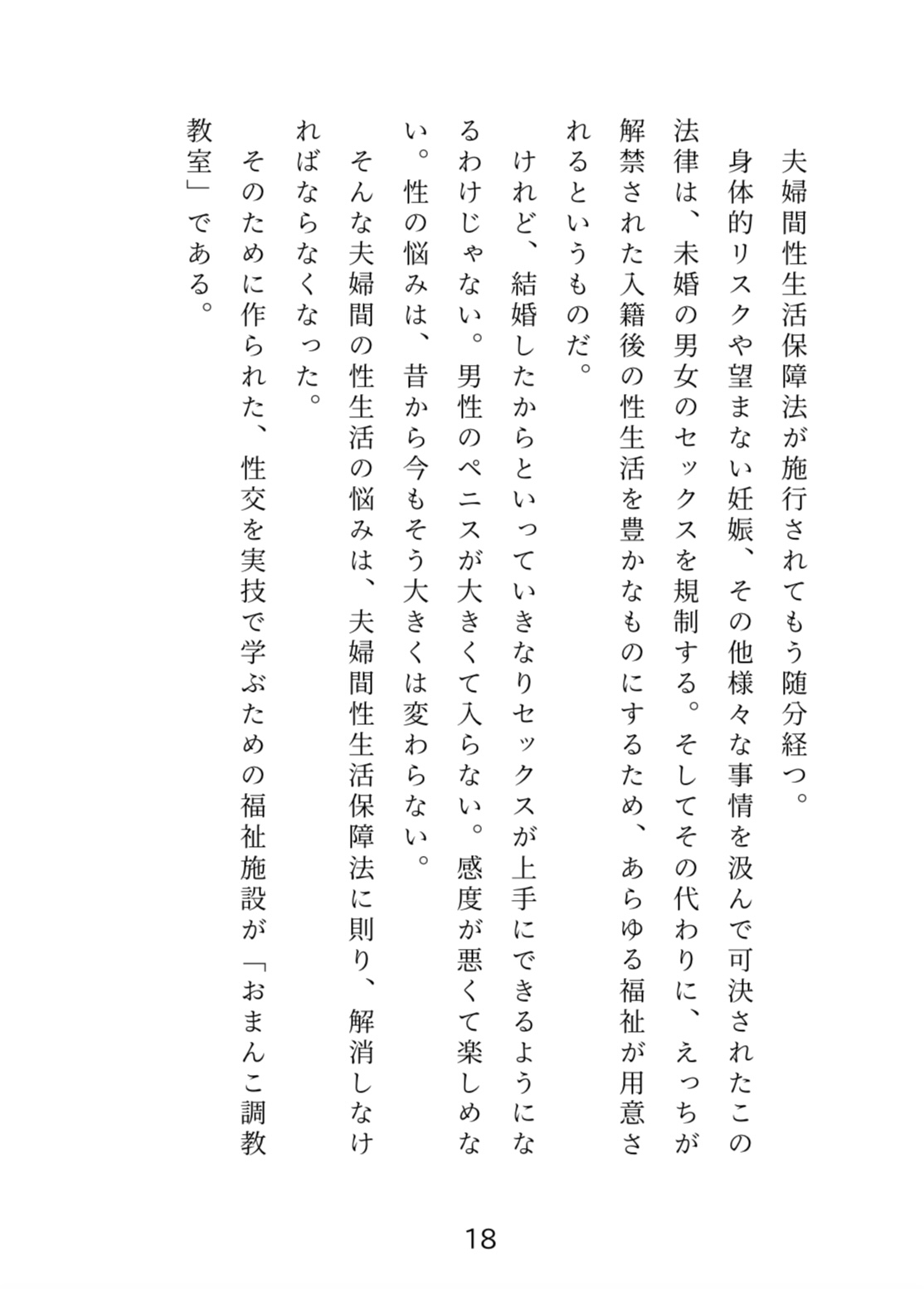 結婚するまで性交渉を禁止する法律が施行された近未来日本。めでたく大好きな鹿島郁斗くんと入籍した私(あなた)は、彼との初めてのセックスでペニスを受け入れることができず、行政から補助金も出るという「おまんこ調教教室」に通うことを決める。ポピュラーな習い事とはいえ彼以外とえっちをすることに抵抗を抱くものの、個性豊かな講師に優しく指導されて、彼好みのおまんこを目指します。3人の調教師と郁斗くんとの本番えっちを収録した短編集。