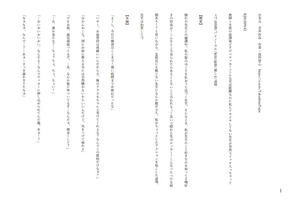 [RJ01343871] (ボイレボ!- Voice Revolution! -) 【AI・商用利用可能シナリオ / R18 女性向け音声作品台本】 男性教師×女生徒 放課後どすけべロッカー シチュ 密室/学園/俺様攻め/年上【シナリオファンド】