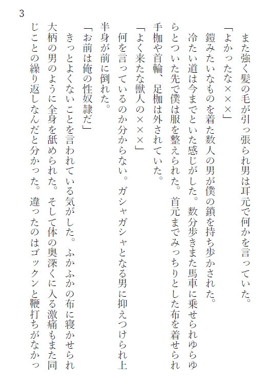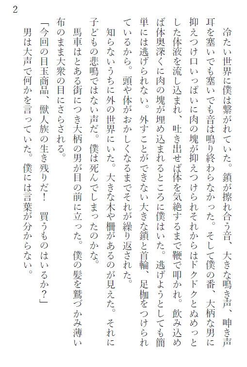 獣人族のうさぎは闇市で買われセナ殿下のお気に入りの性奴○としておかれた。他にも獣人族のオオカミも来たが反抗して殿下を噛み殺していた。