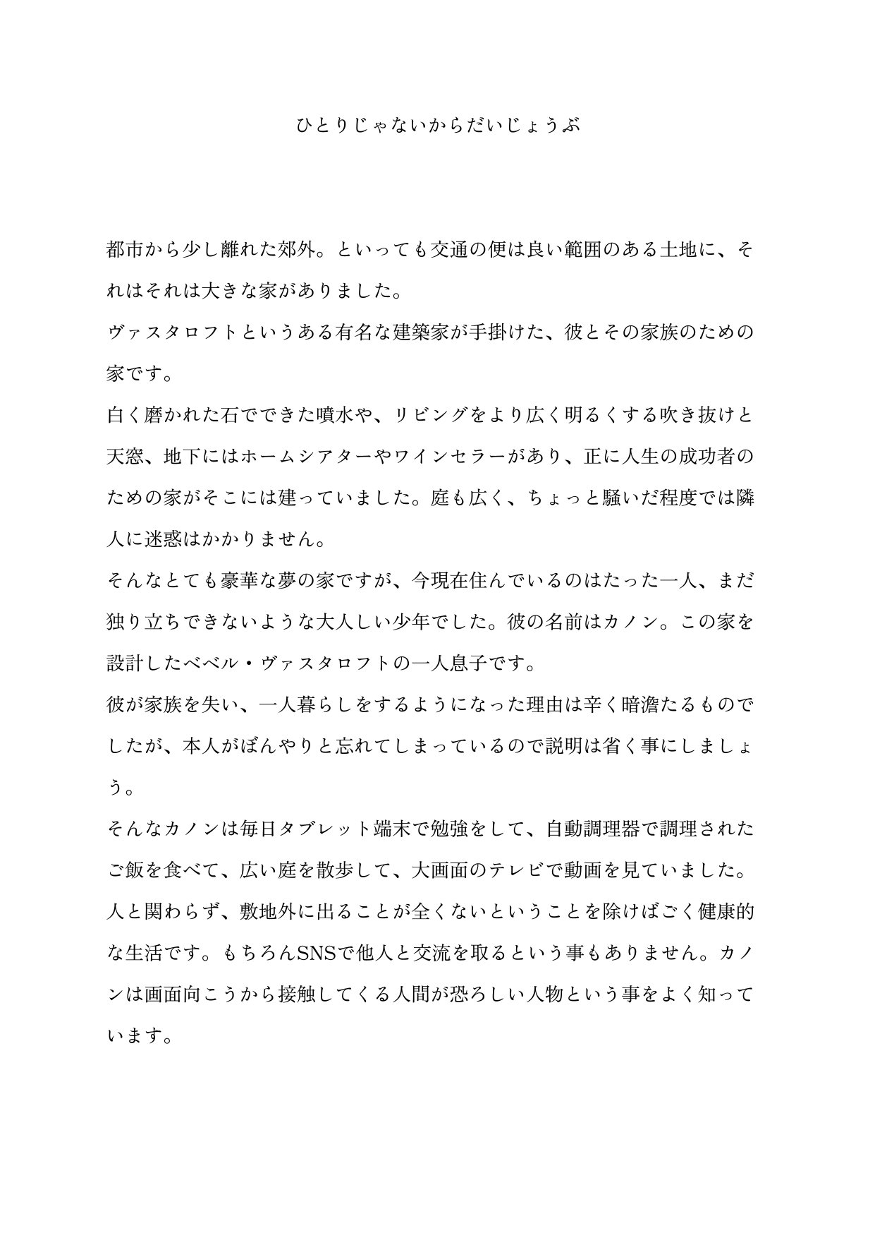広い家に独りきりで住む少年カノン。そんなカノンの元に突然、人の顔を持つ3m程のロボットが飛んできて……
