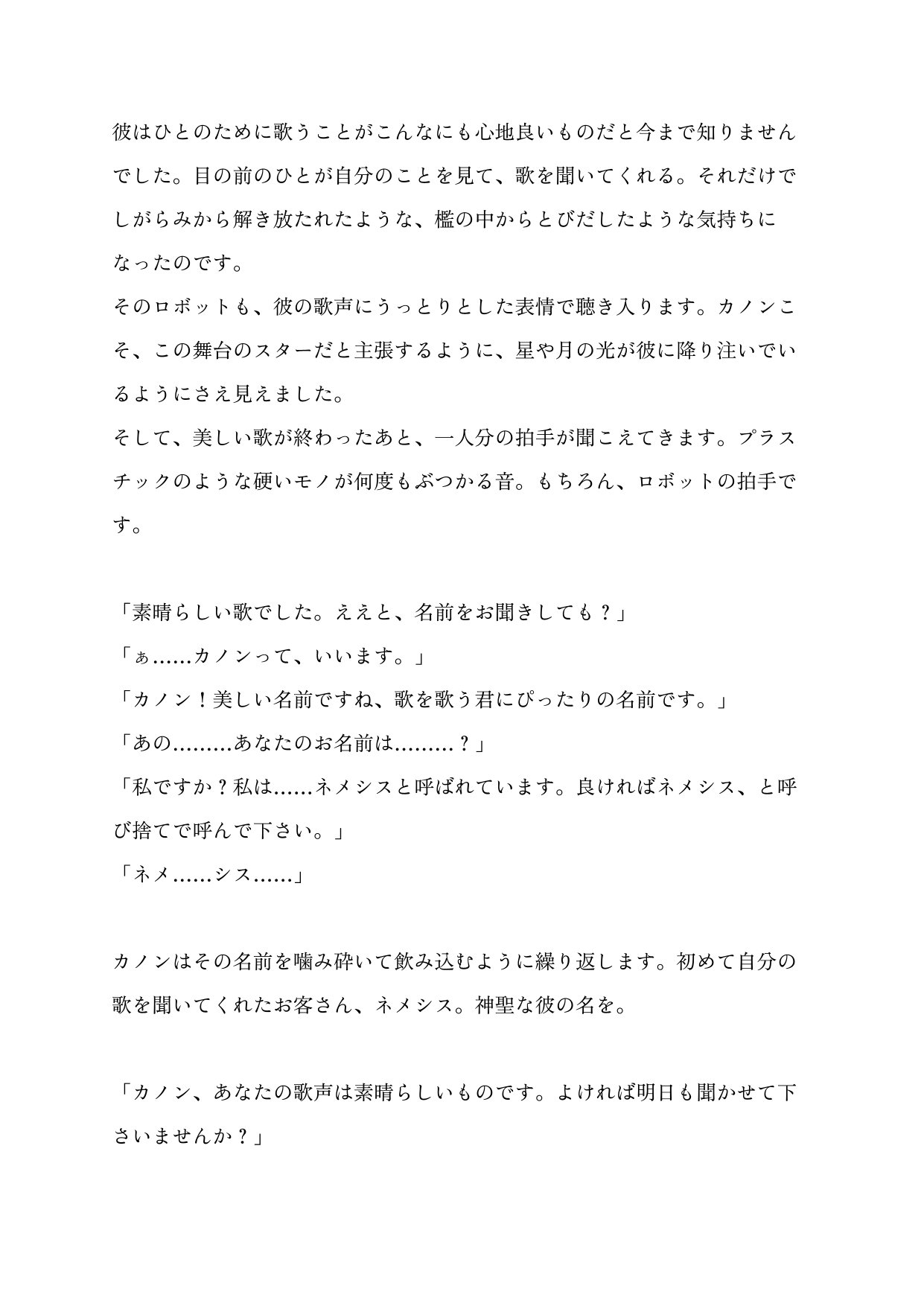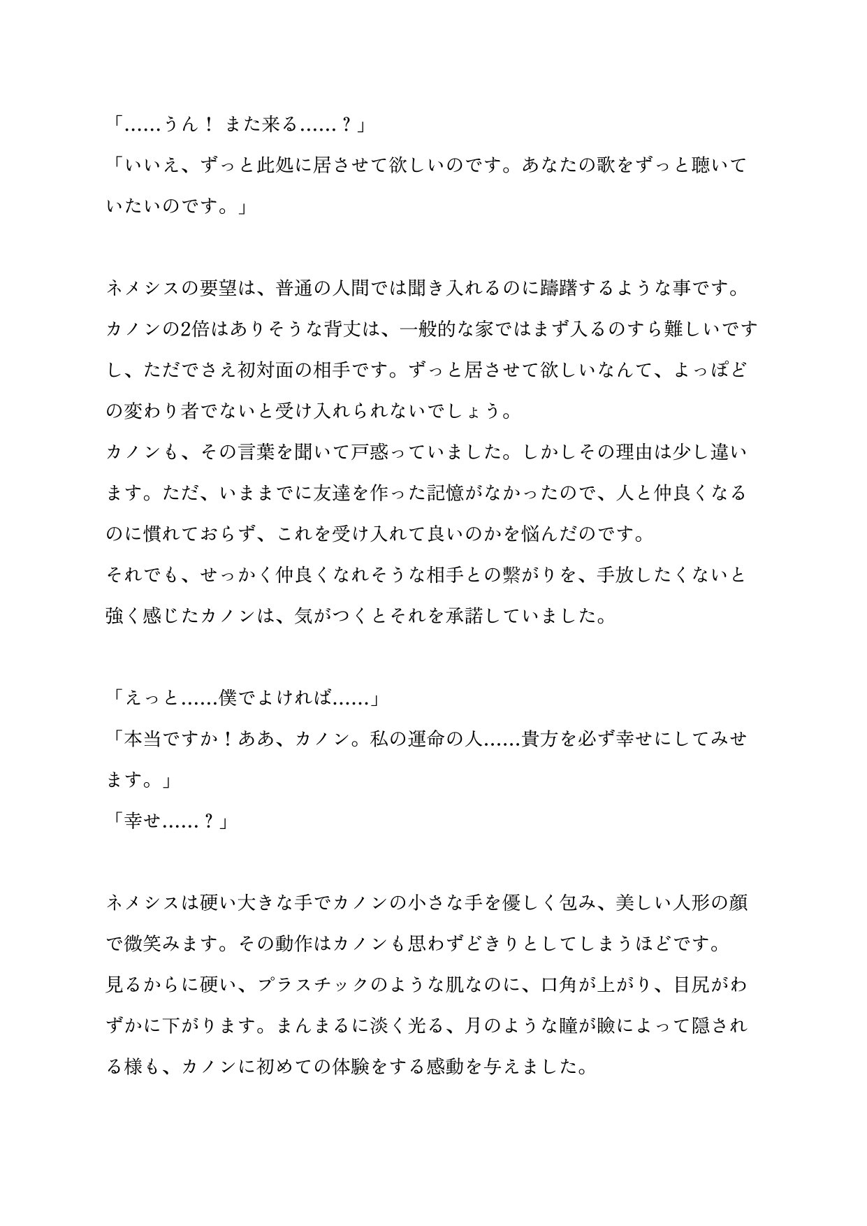 そのネメシスは、カノンの歌声を気に入ったと言い、ずっと此処に居させて欲しいと頼んでくる。ついそれを受け入れてしまったカノンだが、久しぶりの話し相手はどうやら特別な人物で……?