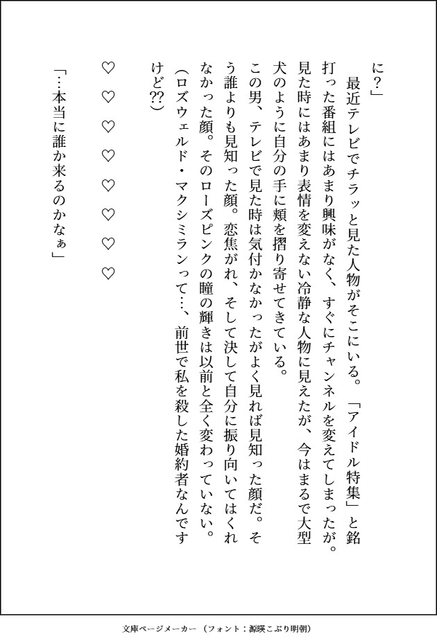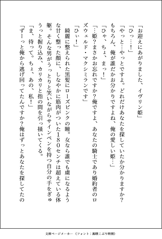 前世の行いが悪かったせいか、今世で現代に転生した梨々子は容姿も人生もだいぶグレードダウンした生活を送っていた。生活も苦しく、前世の記憶を生かして書き続けてきたファンタジー恋愛小説がやっと編集者の目に留まり、書籍化することに。初めてのサイン会に、現れたのはやけにでかくて顔の良い男。梨々子の手を握って、蕩けた表情で「お迎えにあがりました、イヴリン姫」と囁いたのは、前世で自分を殺した元婚約者で騎士のロズウェルド⁉