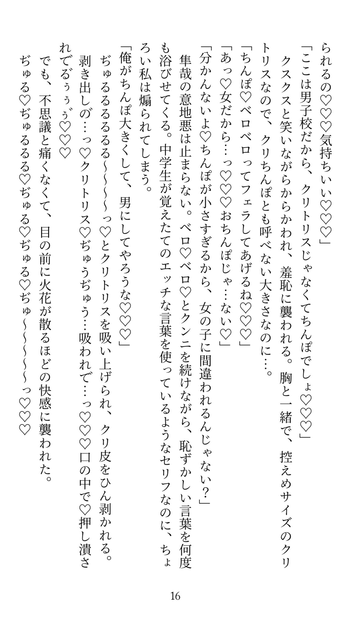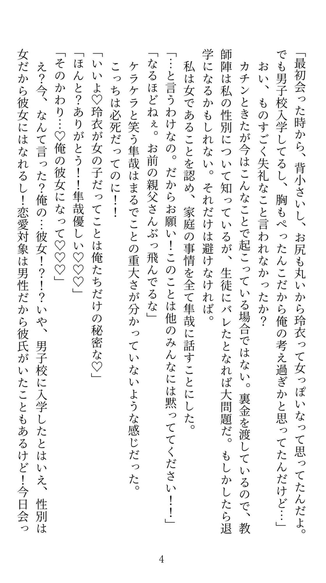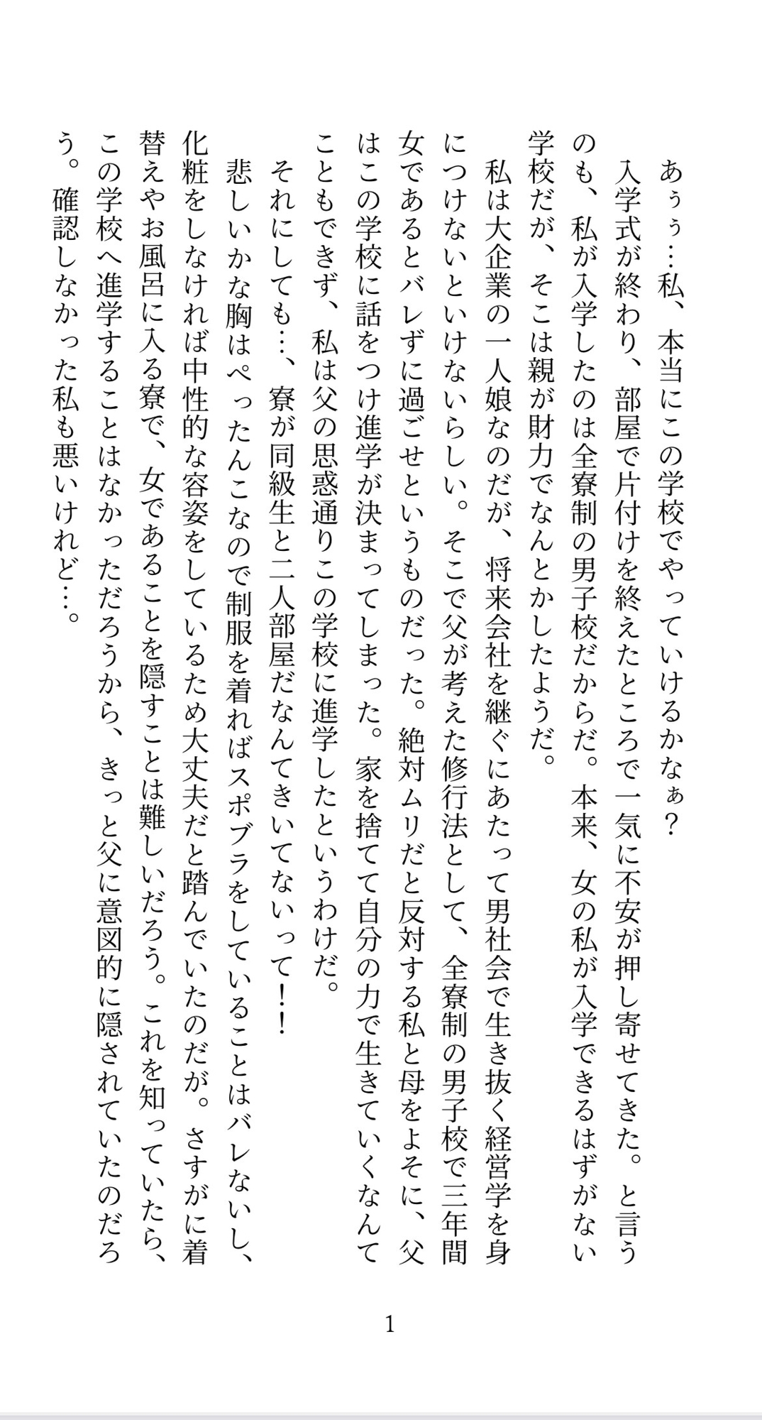 玲衣はとある大企業の社長の一人娘。 いずれは会社を継ぐ者として、 男性社会の中を生き抜く術を身につけないといけない という教育方針のもと、 女子でありながら全寮制の男子校に入学させられた! この秘密は3年間誰にもバレてはけない という状況なのに、入寮初日に相部屋の隼哉(しゅんや)に 女子であることを見抜かれてしまった! 隙をつかれてベッドに押し倒され、 クリシコと潮吹きアクメの気持ちよさを 教え込まれるのだった。
