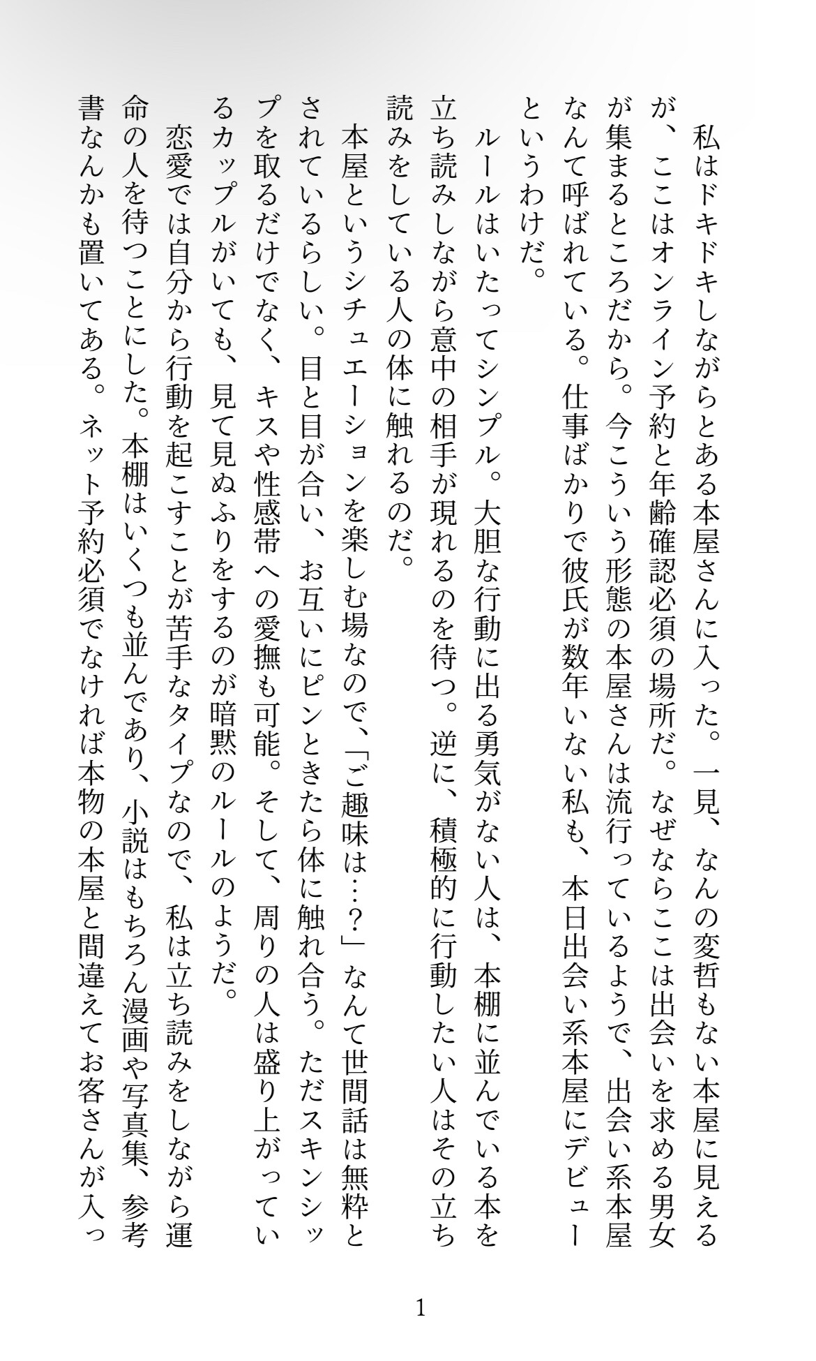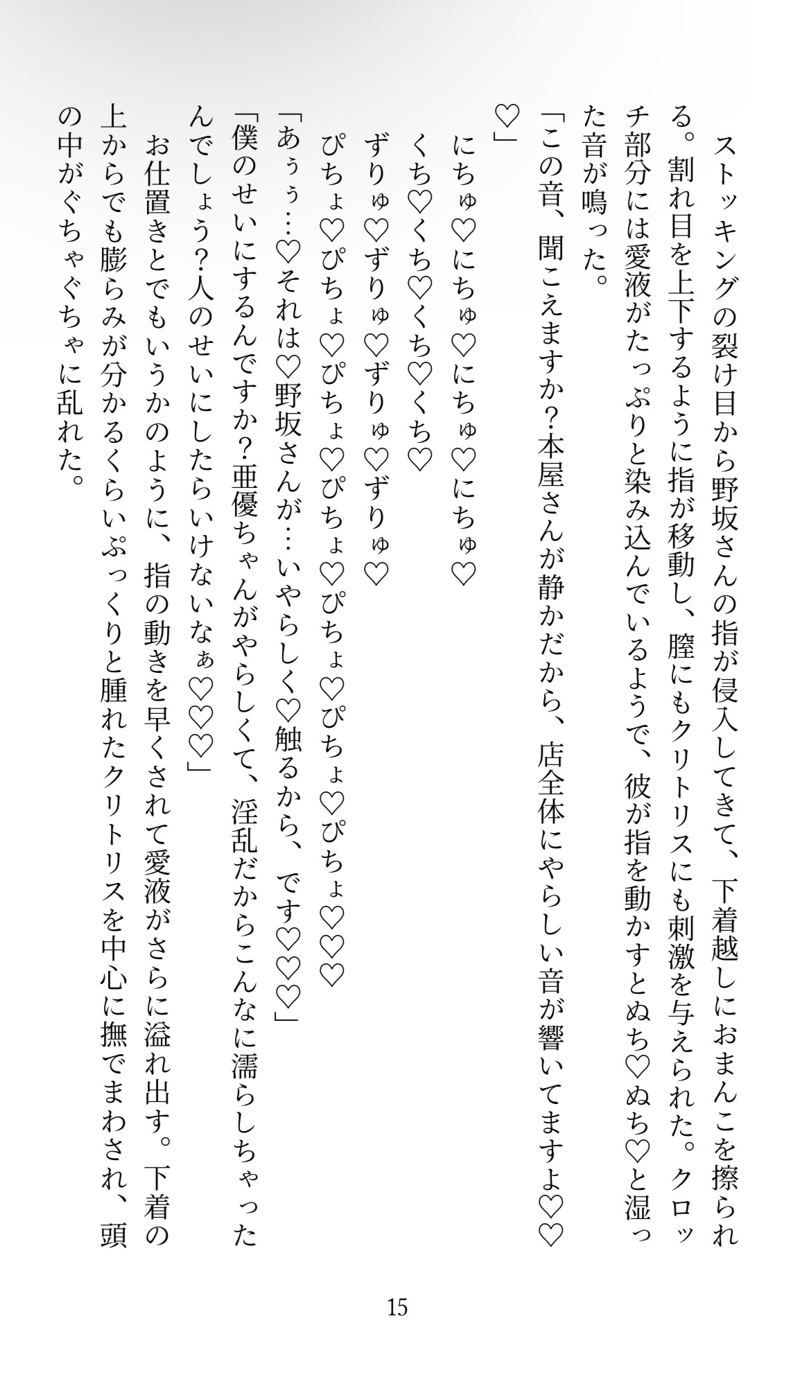 ある日、亜優(あゆ)は 男女の出会いをコンセプトにした 出会い系本屋を訪れた。 大好きな推理小説を立ち読みしながら 運命の相手を待っていると、 彼女の体に触れてきたのは 有名企業のエリートサラリーマン 野坂だった。 彼は爽やかな笑顔が似合うイケメンだけど 女の子をイかせまくりたいという Sっ気たっぷりな願望を持っていて…!? 亜優は本屋の中で立ったまま クリ攻め、クンニ生ハメ、中出しで メロメロにされるのだった。