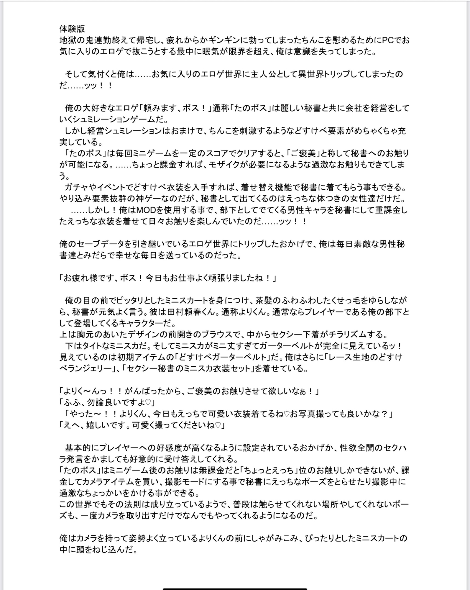 元社畜。PCエロゲーム「頼みます、ボス!(通称たのボス)」にどハマリしていた。元々いる女性秘書よりもMODで無理やり秘書にした元部下の男性秘書が大のお気に入り。重課金勢だった。