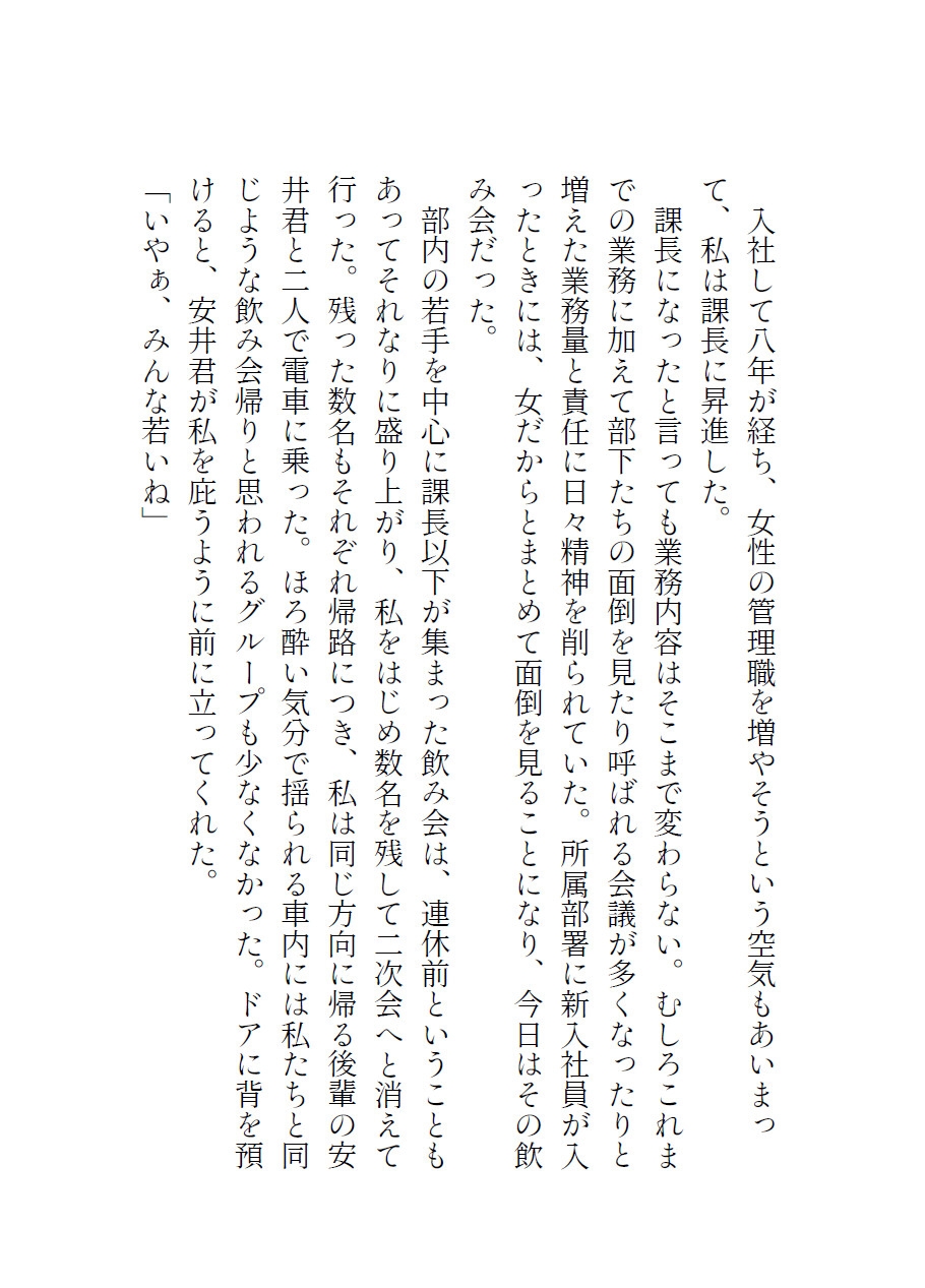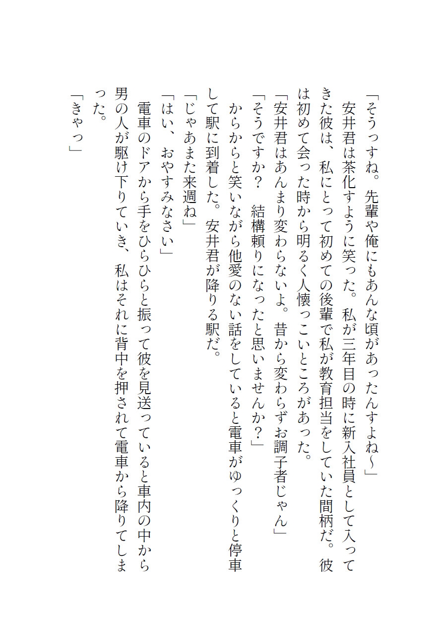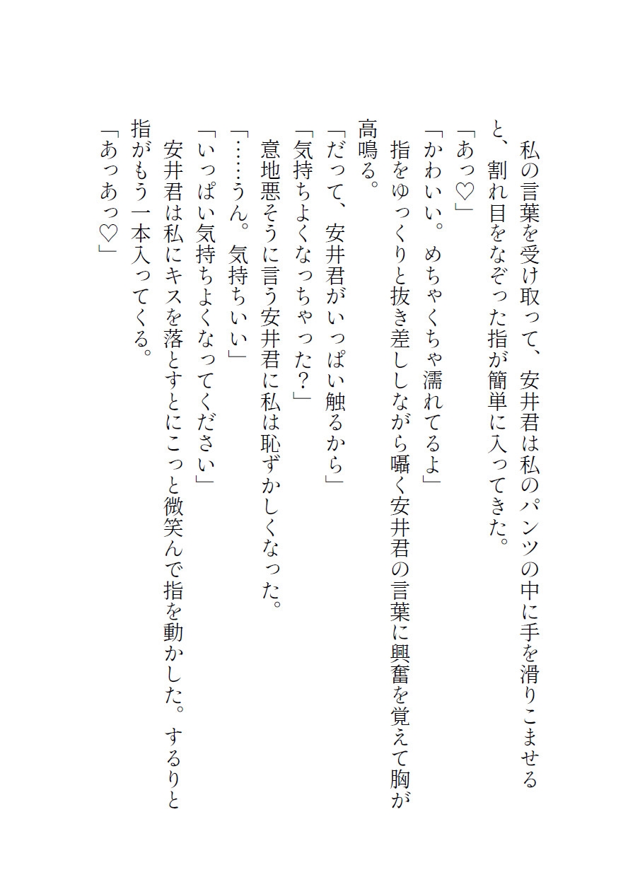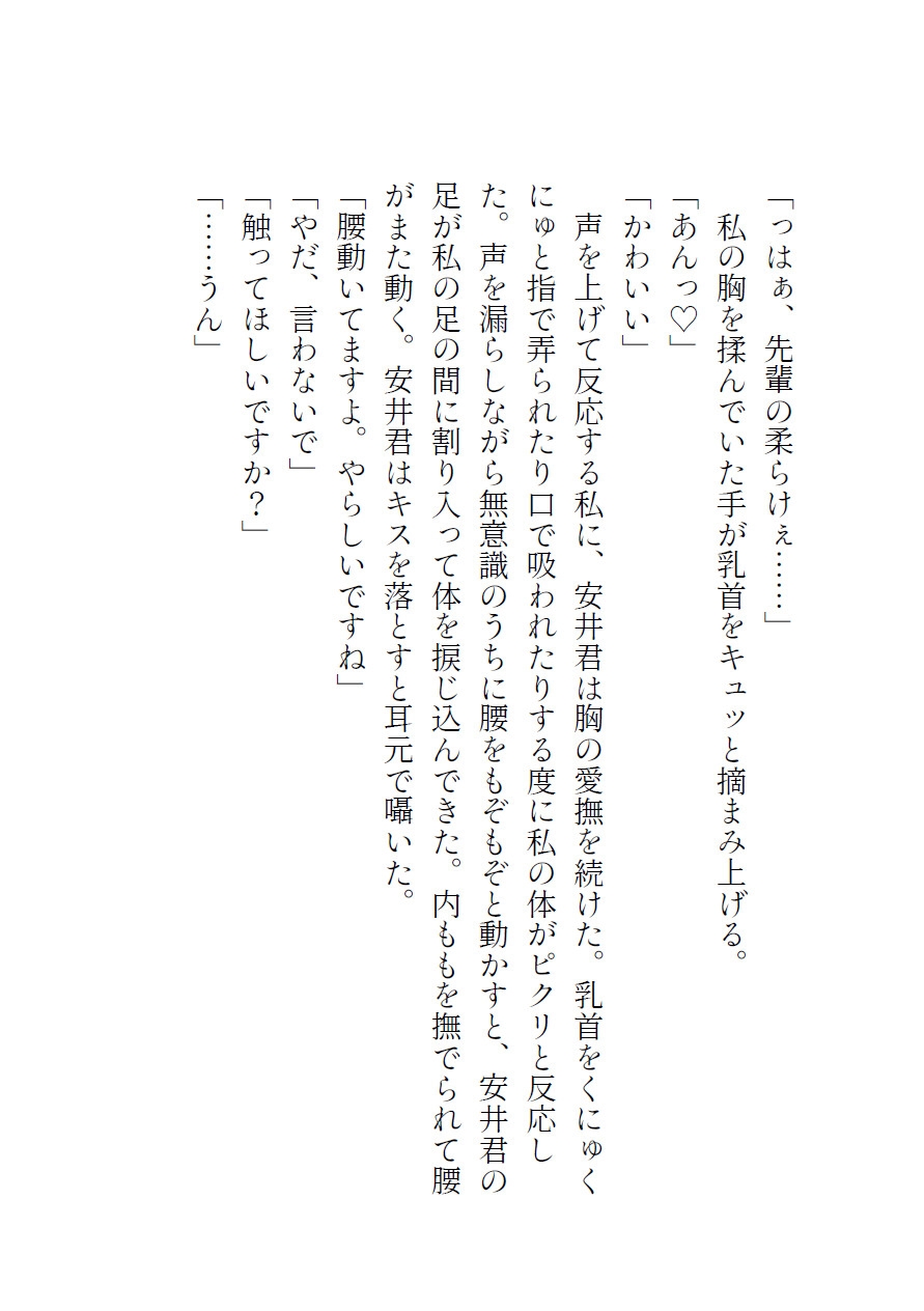 新入社員の歓迎会に参加して、一次会で帰ったあなた。ひょんなことから後輩である安井君の部屋で飲み直すことに。そろそろ刺激が欲しいんじゃないですかと誘われて断るも「俺、結構本気で言ってんすよ」と言われてベッドへ。