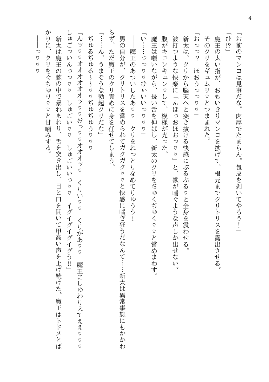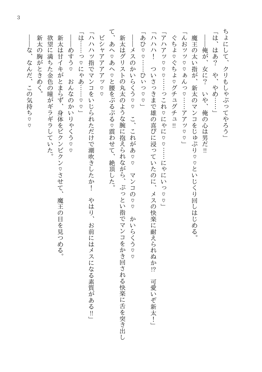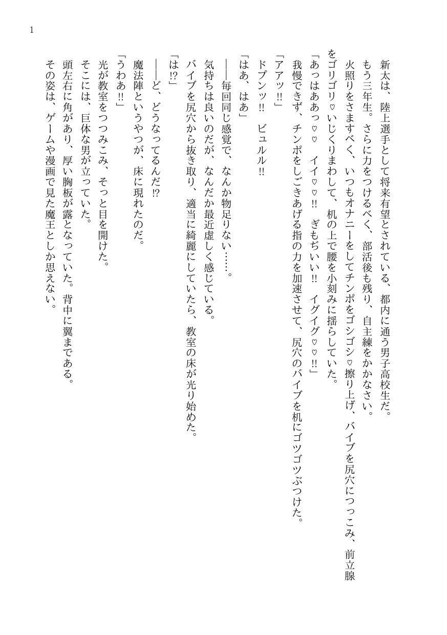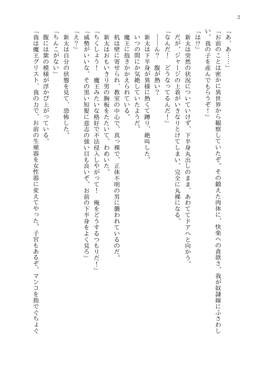 都内の学校に通う男子高校生、日野新太 (ひのあらた)は、陸上部の自主練後に密かに教室でオナニーと、前立腺をバイブで弄るのが日課だった。 たっぷり快楽を味わい、絶頂していたら、教室に魔法陣が出現し、異世界からやってきた魔王グリストという巨大な男に襲われた。 腹に淫紋を施され、肉体をカントボーイにされてしまう。魔王に孕まされ子を出産、オーク、ゴブリン達の孕み袋となり、不老長寿となった身体でメス奴○嫁として歓喜する。。