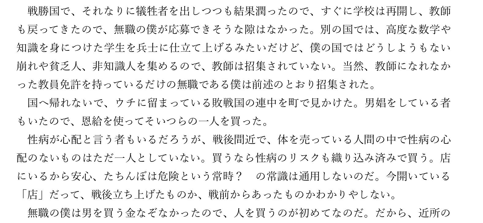 カップリング:上官×兵士 / 戦勝国無職×敗戦国男娼 /