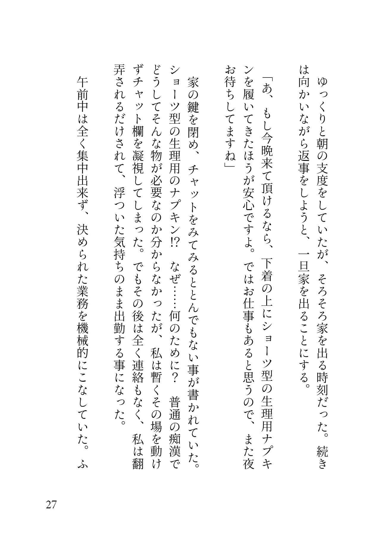 考えが甘かったのかもしれないが、今までは手の甲や指先で軽く刺激される程度だったので、スカートの中に、しかもショーツ型ナプキンの中にまで手を入れられて……私は内心とても焦っていた。