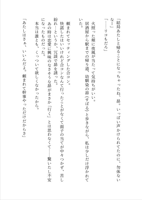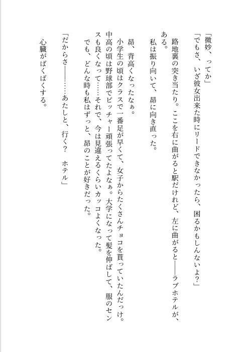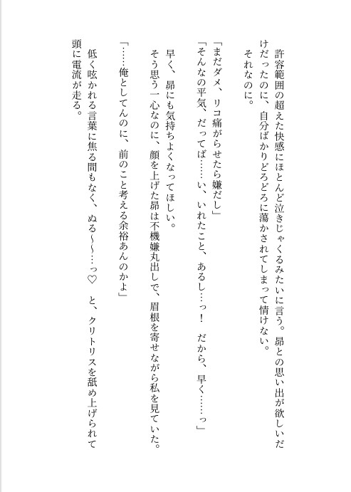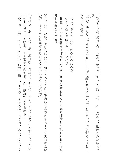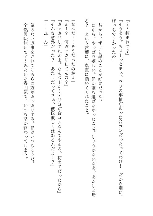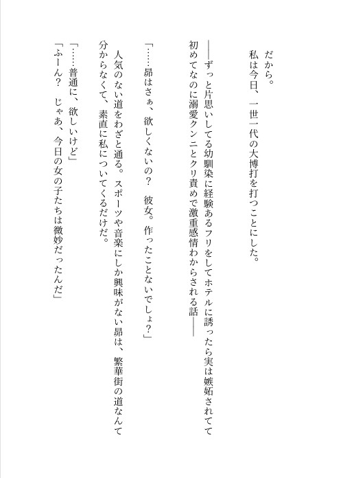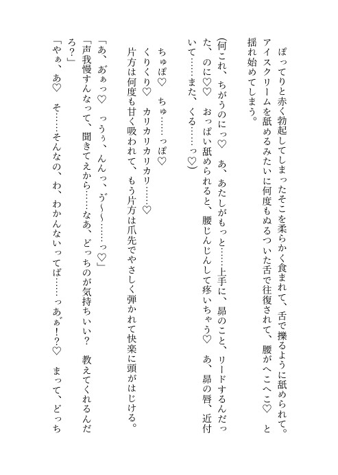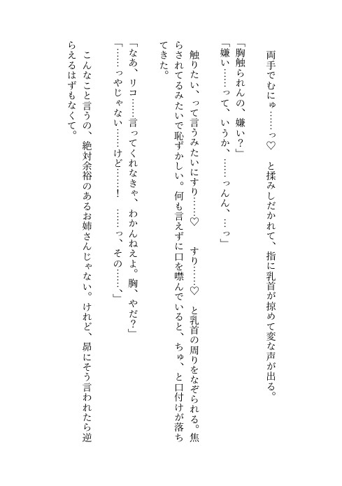 小さい頃からずっと好きだった幼馴染の昴となんとか一夜だけでも共にしたくて、経験あるフリをしてホテルに誘うリコ。無事にホテルに行ってリードしようとするもののあっという間にペースを握られて甘々クンニされてしまう。早く入れてほしくて「入れたことあるからもう大丈夫」と言うが、昴はそれにすごく怒って……。
