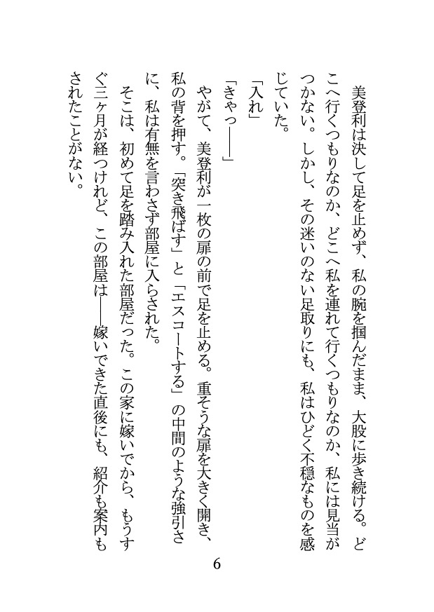 旧華族の名家・胤門(たねかど)家に嫁いできたばかりの粧子(しょうこ)は、ある日、言い付けを破ったとして、夫の美登利から「躾」をされることになる。