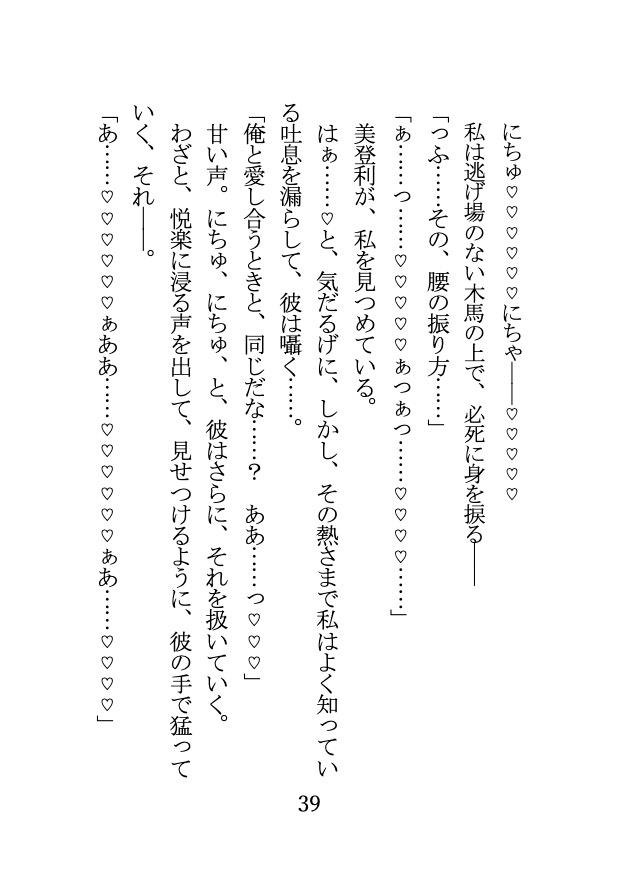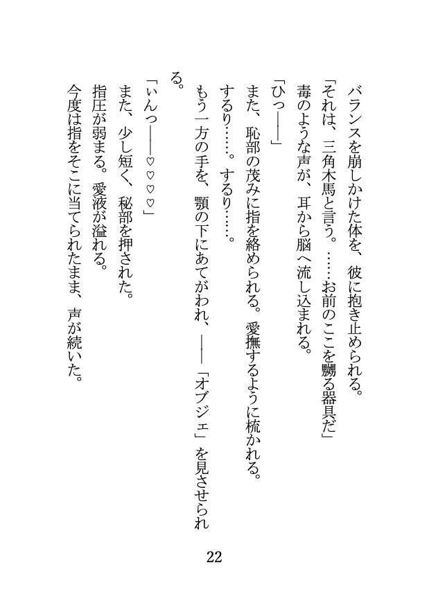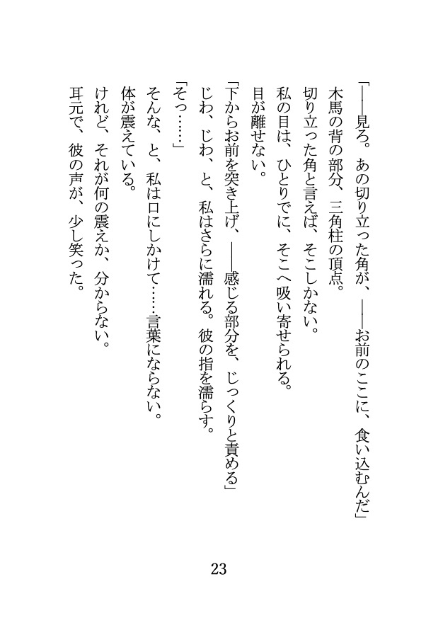 視姦、ストリップ、羞恥、命令、三角木馬、拘束、乳首責め、執着責め、バック、焦らし、ポルチオ責め、子宮責め、中出し、騎乗位とみちみちに詰まった2.5万字。