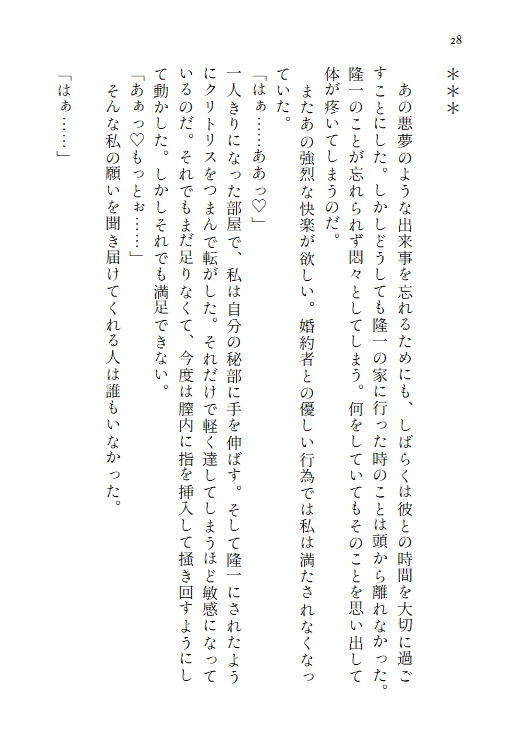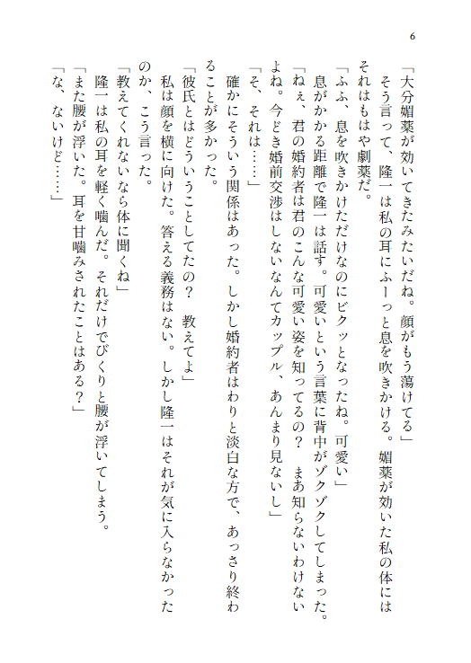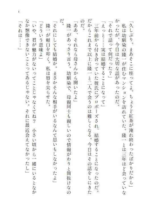 三年前から付き合っていた彼氏と婚約したので、幼馴染の隆一にその報告に行く。隆一に対してはいい友達だと思っていた。