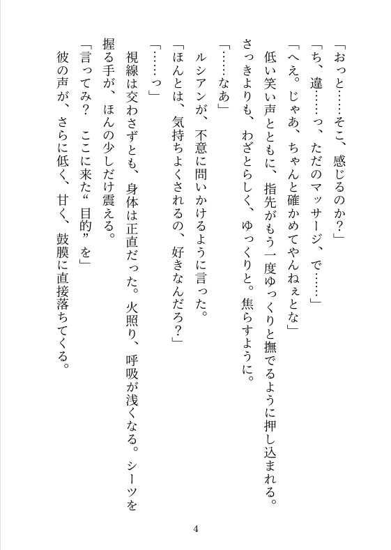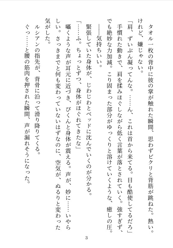 普通のマッサージから始まるはずが、巧みな指遣いにほぐされた身体は、いつのまにか悦楽を求めるようになり。