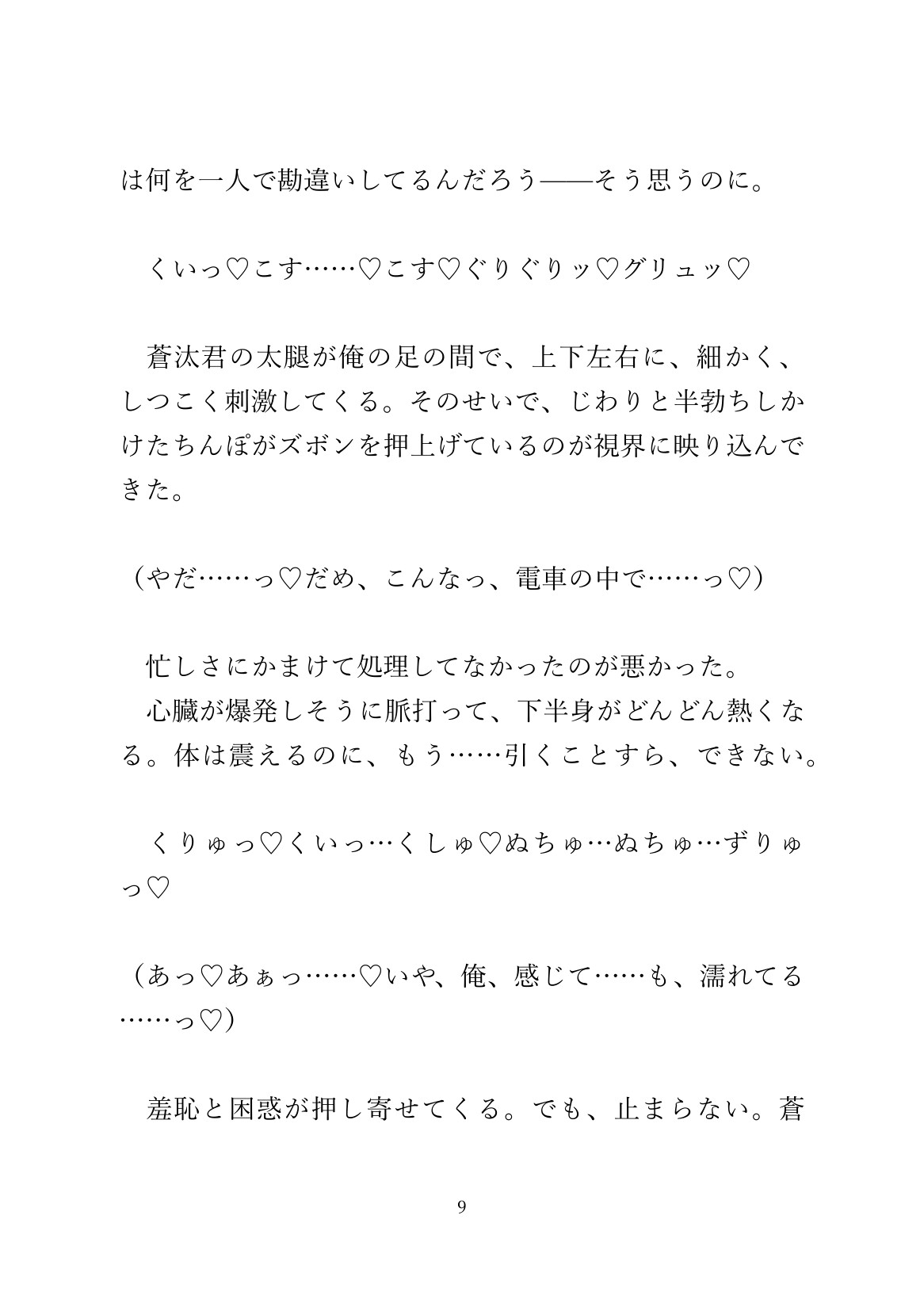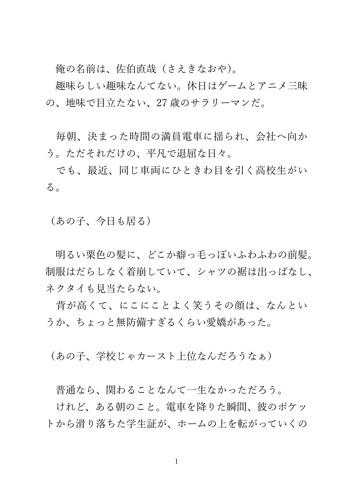 たまたま同じ車両に乗り合わせるようになったチャラい高校生に懐かれたサラリーマンが、懐かれ過ぎた結果、電車の中で乳首やちん〇を弄られて気持ち良くさせられちゃう話。