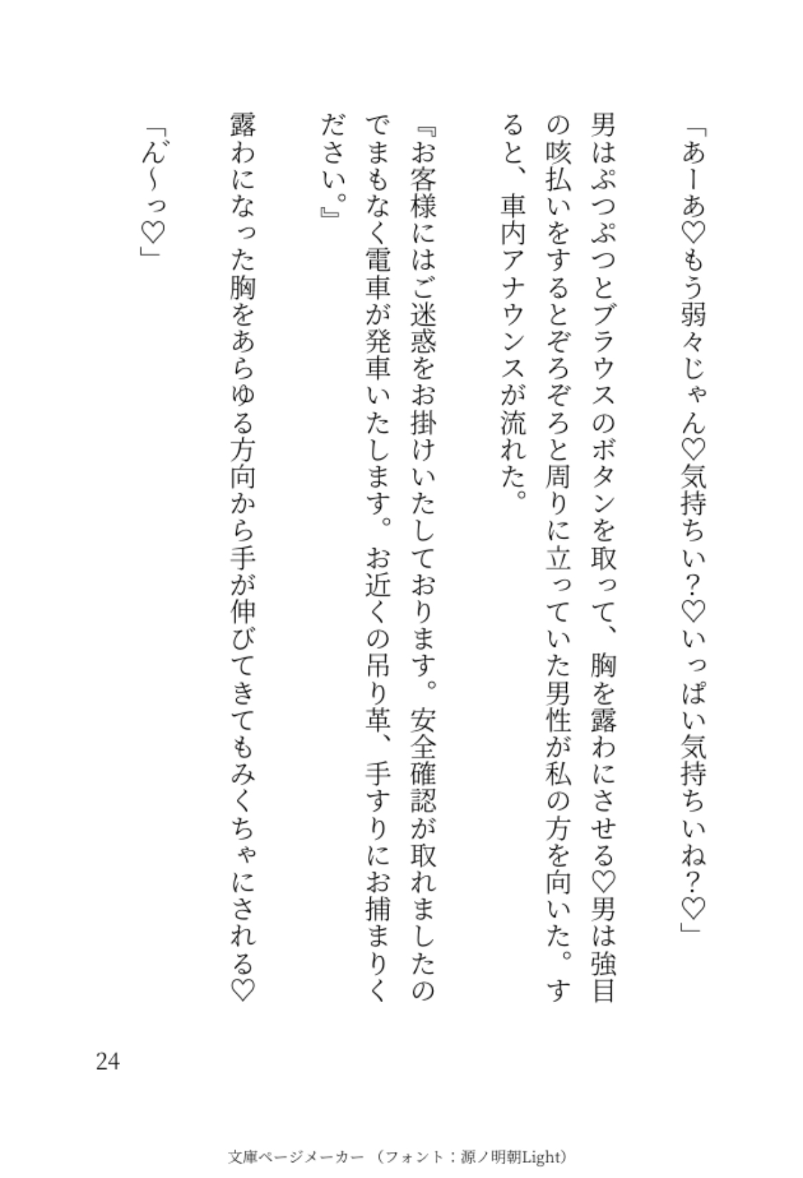 出張のため朝の満員電車に大きなキャリーバッグを持ち込んだ「私」は、周囲の冷たい視線や押し寄せる人波に気圧されながら、揺れる車内で必死にバランスを取っていた。ロングスカートの裾を気にしつつ、立ち位置を確保しようと奮闘していた矢先、電車が急停止。人身事故の影響で電車はしばらく動かないというアナウンスが流れる。会議が明日であったことに安堵した直後、ふらりと倒れ込むようにぶつかってきた男性――その瞬間、「私」の静かな朝は少しだけ揺れ始める。普段、読んでいる時にヒロインの名前が自分と違ったり