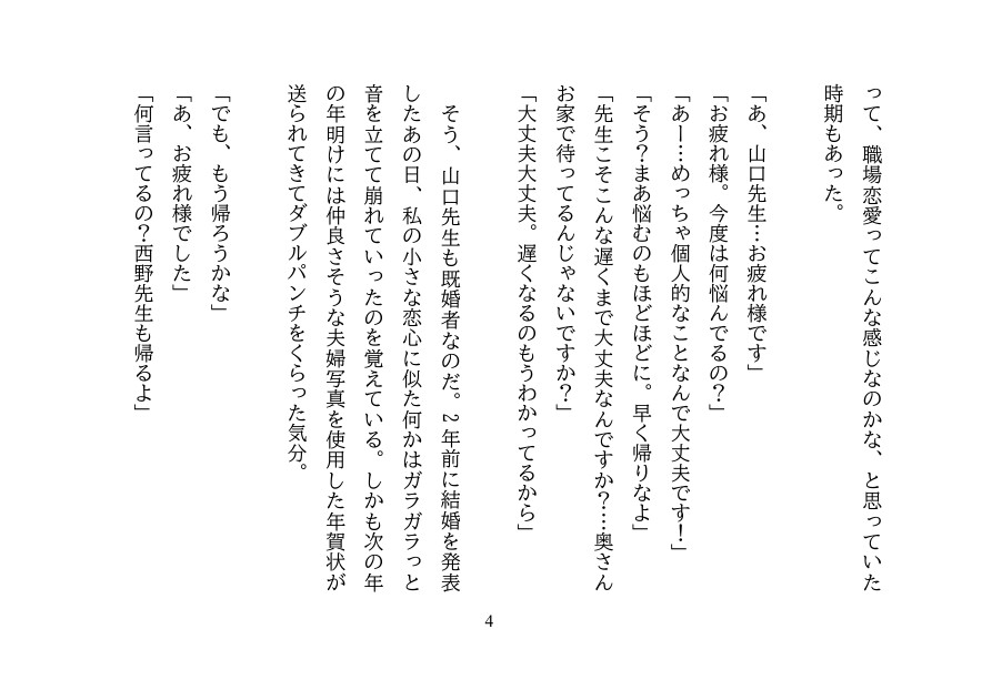 何度も既婚者に騙されてきた男運運がないヒロインが、職場の既婚者の先輩に恋するお話