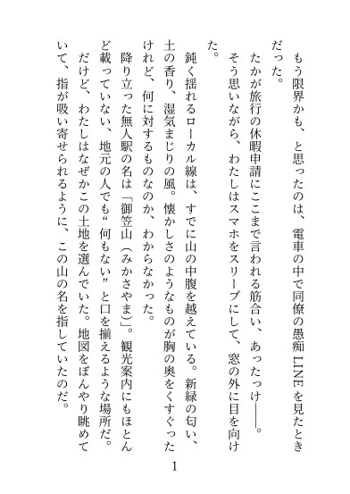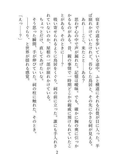 仕事に疲れ果てたOLの花。逃げるように旅行で訪れた山の中で、苔むした鳥居と小さな祠を見つける。
