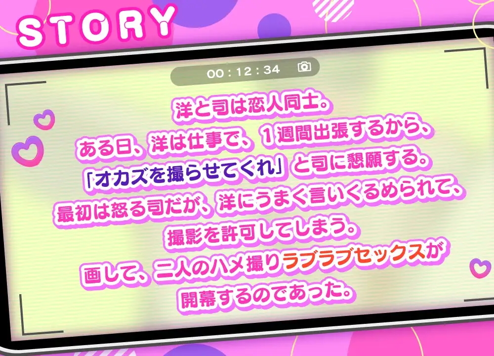 요우와 츠카사는 연인 사이. 어느 날, 요우는 1주일간 출장을 가게 되면서 “딸감 좀 찍게 해줘”라며 츠카사에게 간청한다. 처음엔 화를 내는 츠카사였지만, 요우의 능청맞은 말솜씨에 결국 설득당해 촬영을 허락하고 만다. 그리하여, 두 사람의 삽입 촬영 러브러브 섹스가 시작되는 것이었다.