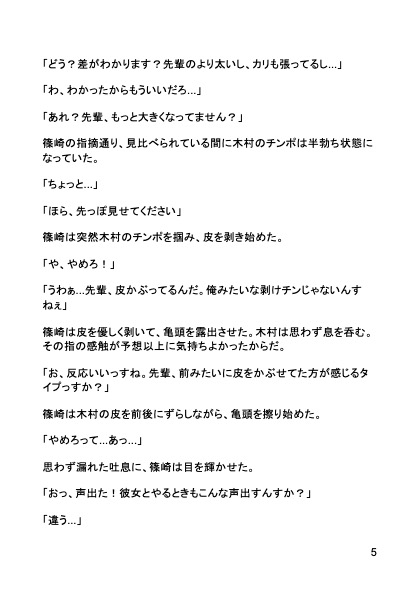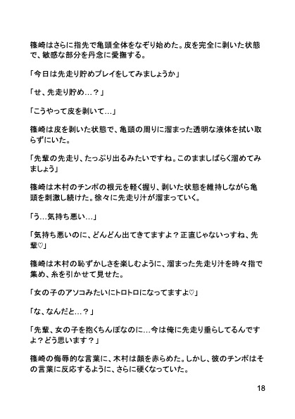 軽薄な笑顔で追い詰めるチャラ後輩に、ノンケ先輩は抗いながらも反応を隠せず、普通サイズを執拗に見下され、比べさせられ、イカされてしまう。