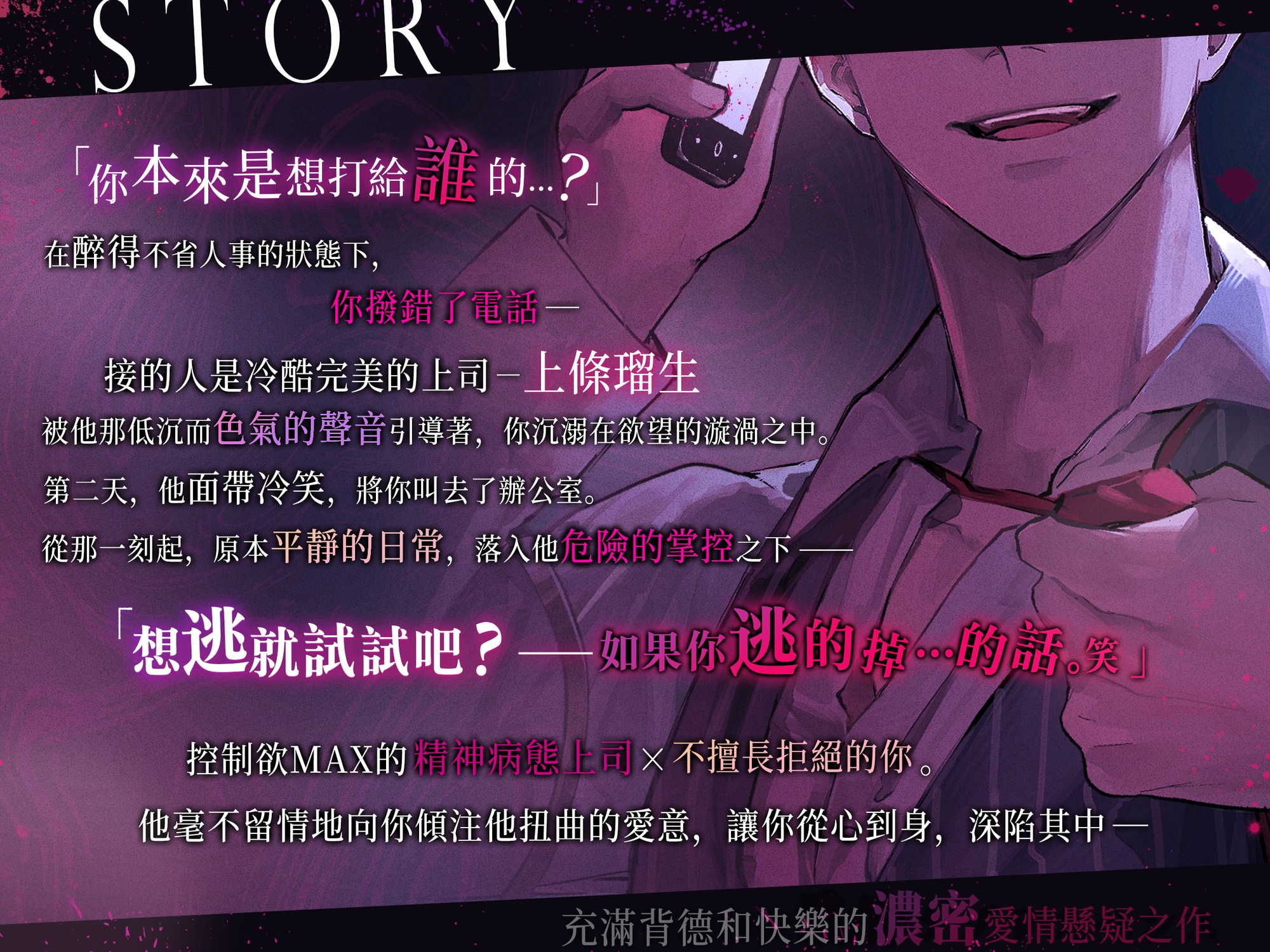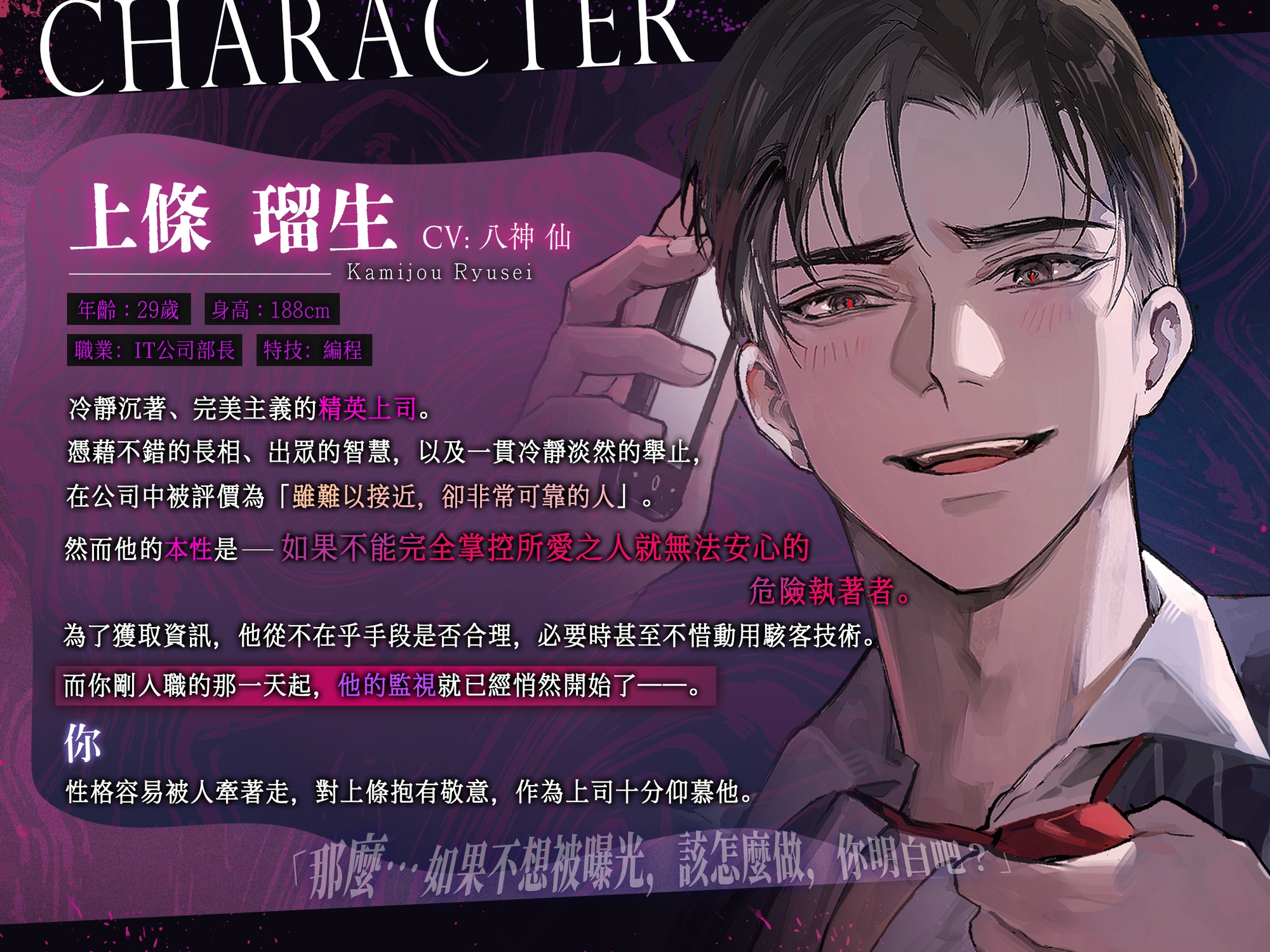 上條瑠生是你可靠且能幹的上司,對工作中的錯誤和公司規定非常嚴格,外貌出眾,但也因此顯得有些難以接近。