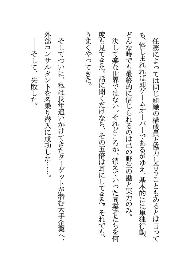 正義感が強く、単独任務にも臆しない優秀なスパイ・霧谷怜里(きりたに れいり)。彼女はついに、長年追いかけてきたターゲットである武器商人・真木誠司(まき せいじ)との接触に成功する。外見だけは爽やかな好青年だが、後ろ暗い世界を渡り歩いてきた男だ、油断はできない。