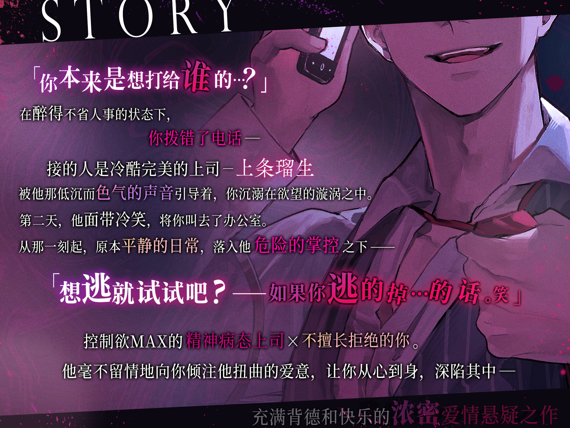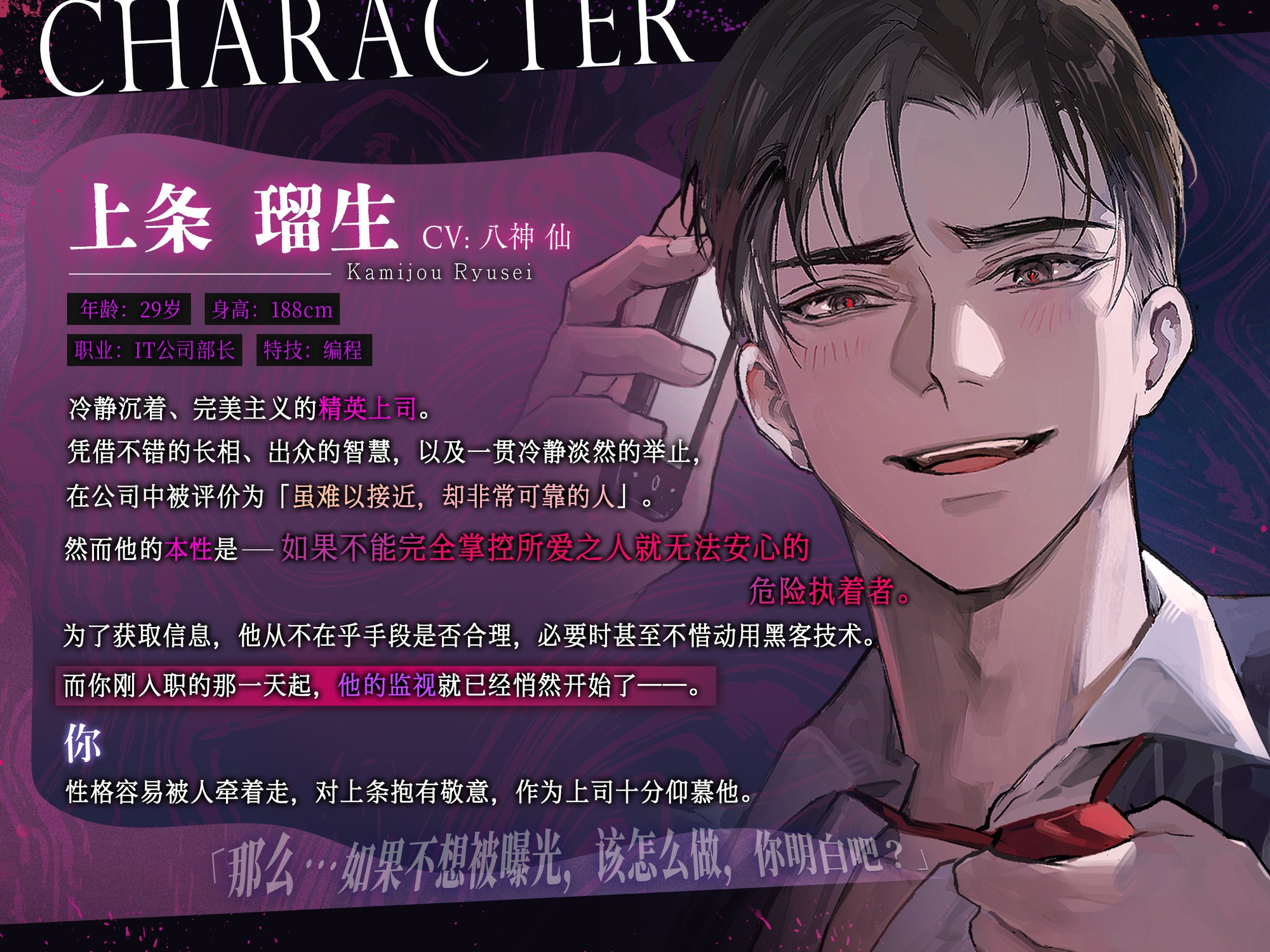 上条瑠生是你靠谱且能干的上司,对工作中的错误和公司规定非常严格,外貌出众,但也因此显得有些难以接近。