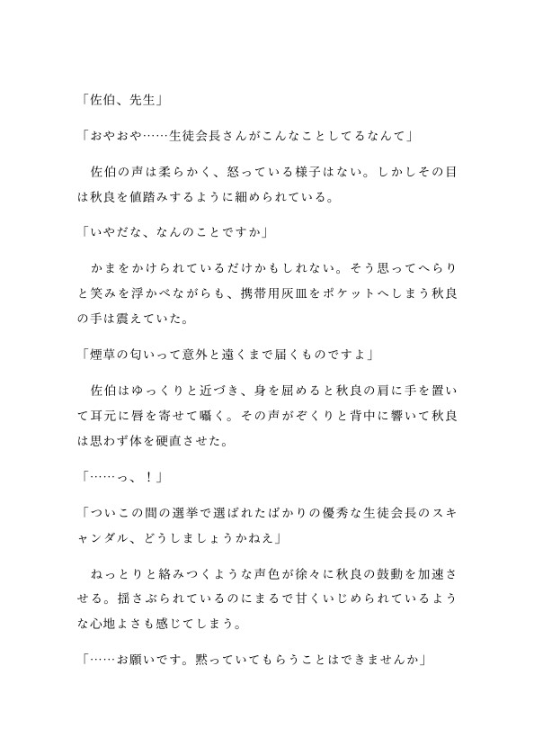 ■受け…白石秋良(しらいしあきら) 17歳 生徒会長 優等生だが重圧に押し潰されそうな日々を送っている。入学した時から佐伯に憧れていた。