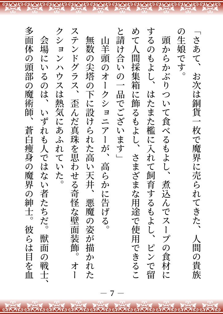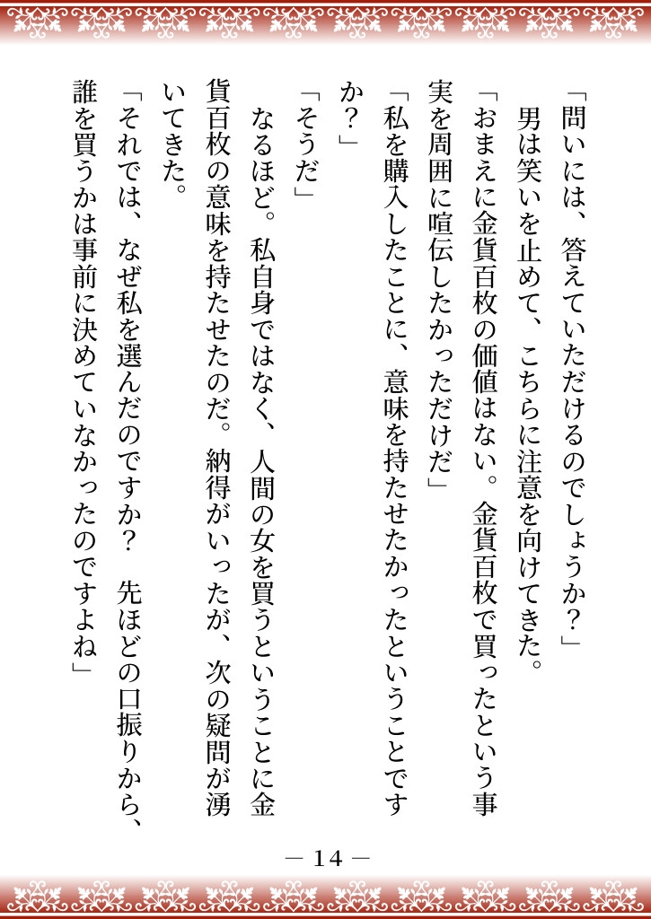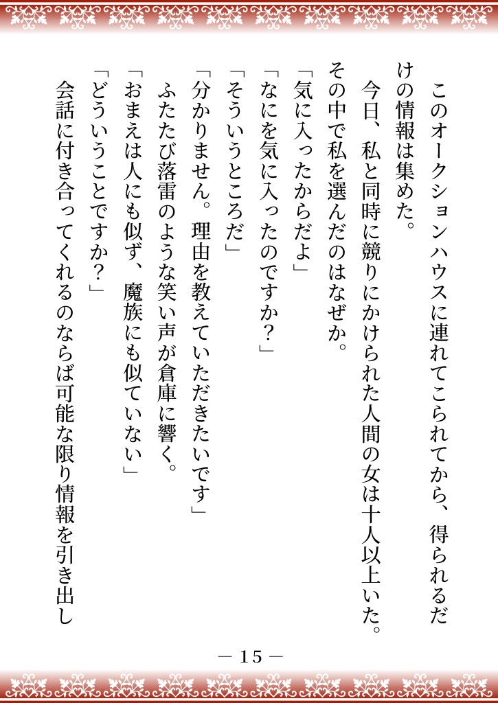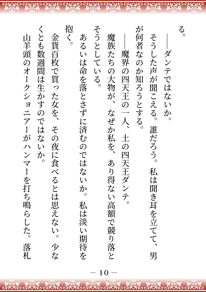食肉として売りに出された彼女を、魔界の四天王の一人ダンテが、金貨百枚という大金で購入した。