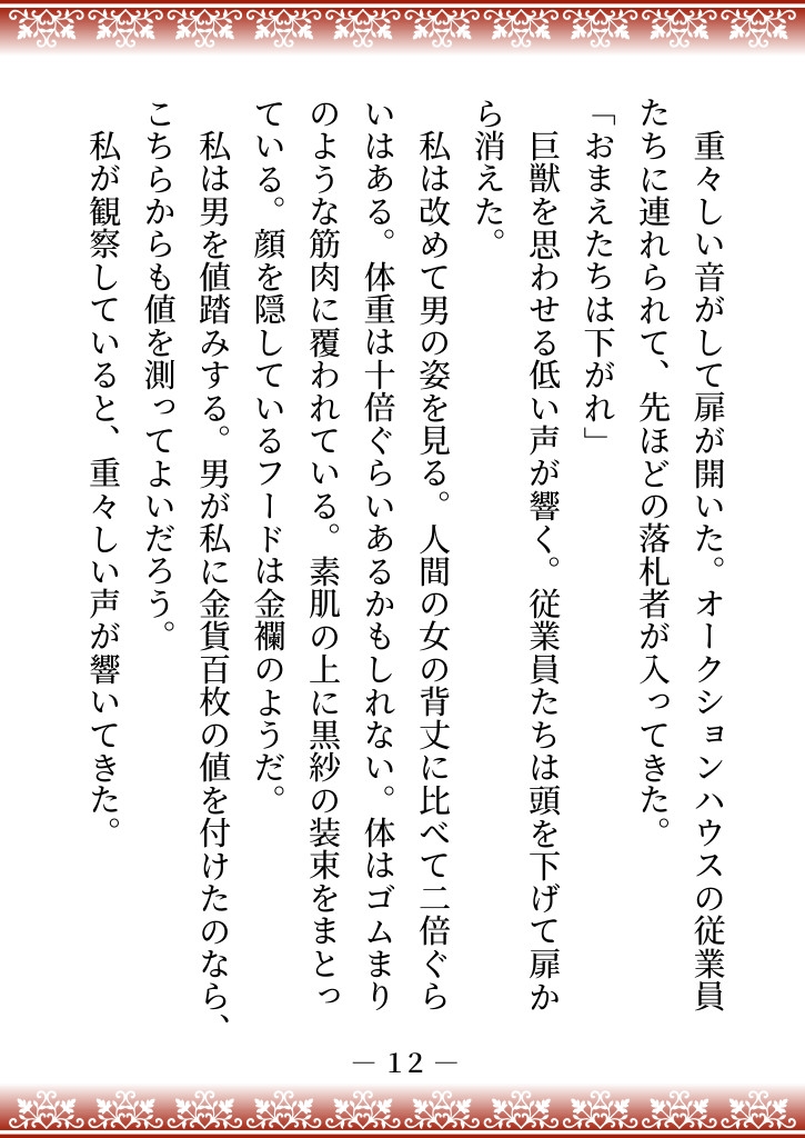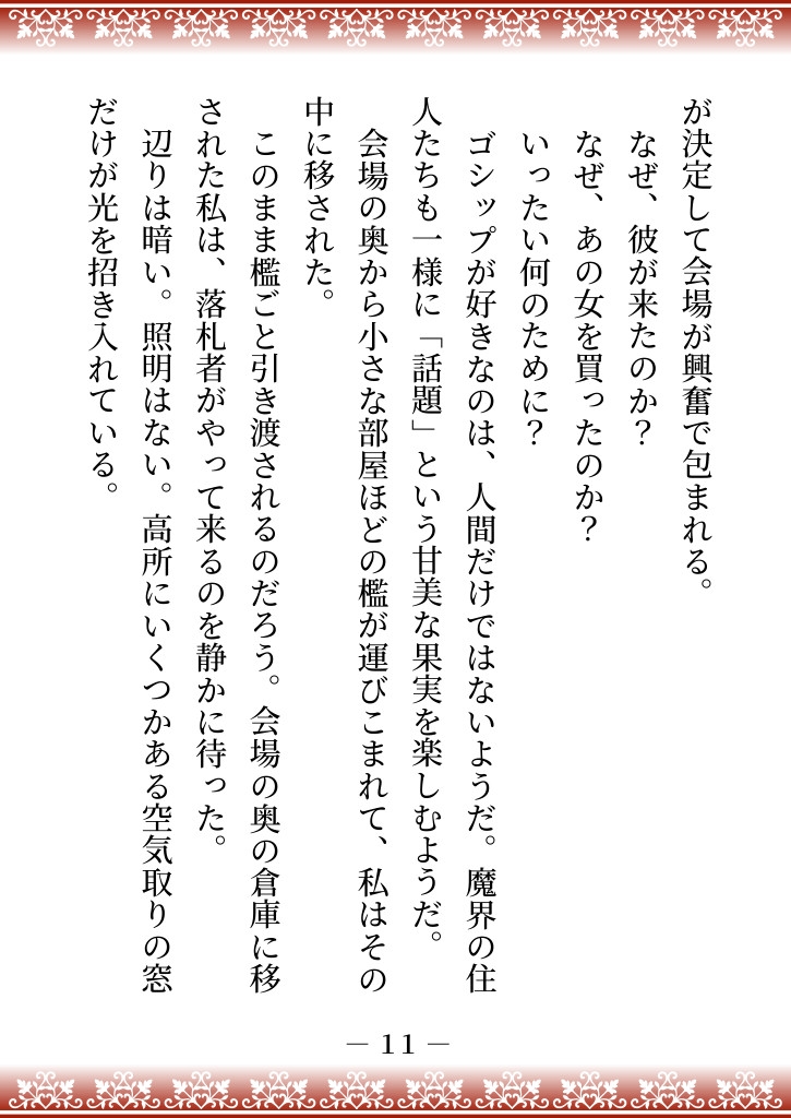 性悪継母に逆らった伯爵令嬢は、魔界に売られて裸でオークションにかけられる。食肉として売りに出された彼女を、魔界の四天王の一人が、金貨百枚という大金で購入した。四天王は人間の妻を得て、子を作る必要があるという。四天王と伯爵令嬢は子作りを通して、次第に愛を育んでいく。