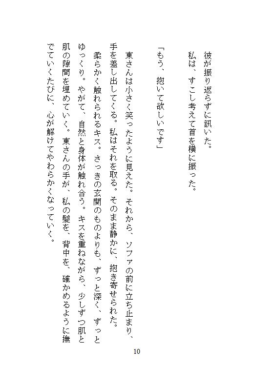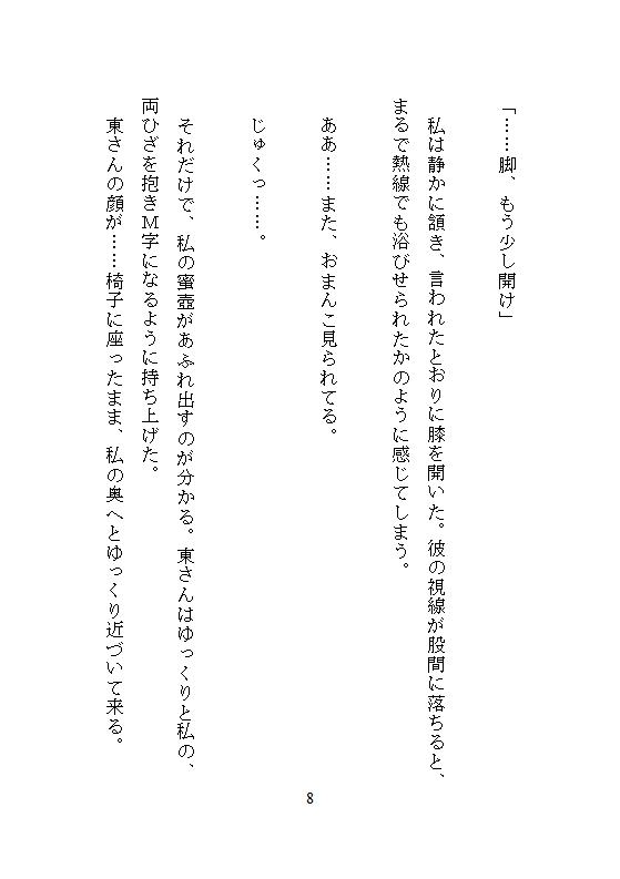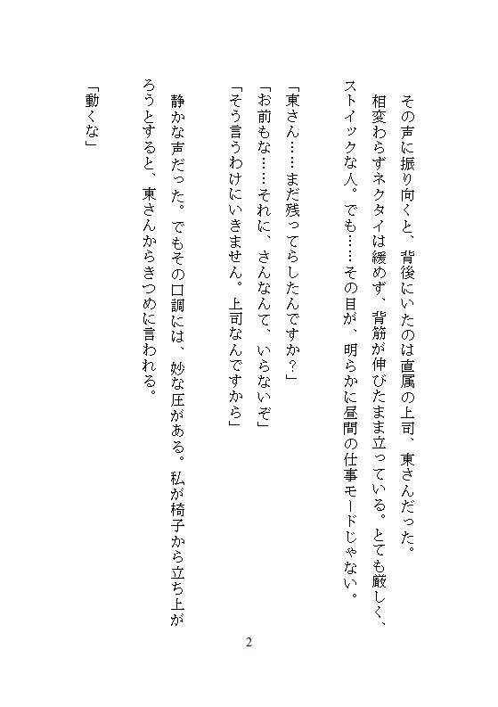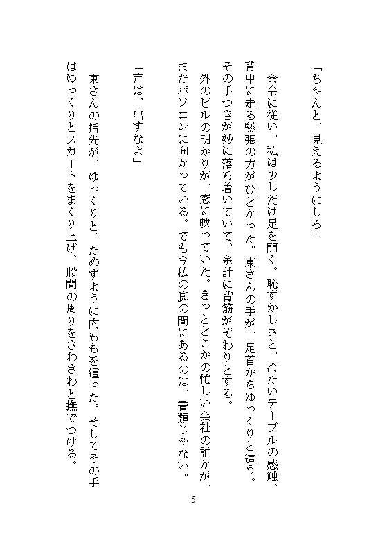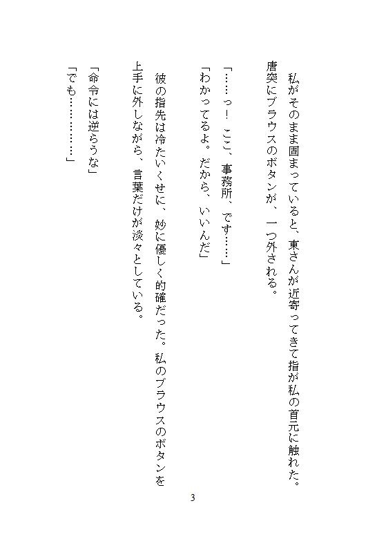 最初は戸惑いながらも、その声と指先に逆らえず、私は商談テーブルの上、ホワイトボードの前で、秘密の命令に従っていく。その命令は、私の体を震わせ、繰り返される行為は、やがて身体だけでなく、心まで縛っていくのだった。命令と快楽、そして感情の境界が曖昧になる、本当にあった大人のオフィス官能の話です。