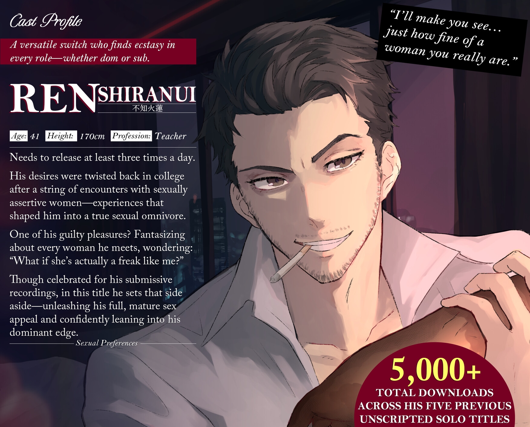 After over 5,000 downloads with his raw, unscripted moaning audios, Ren returns under a new name in “Mr. Ren’s Real-Time Hands-On Mating Lesson. Raw, unscripted teasing warped my body into lust.”