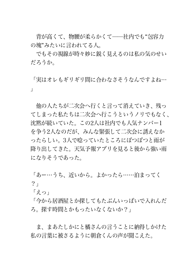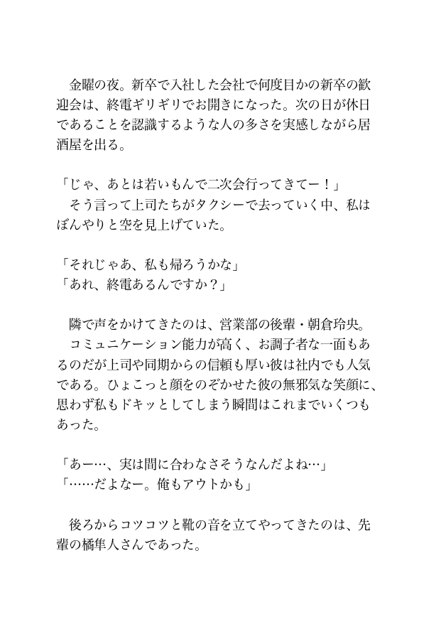かっこいいというよりも可愛い顔立ちだが、橘さんと同様に社内で人気のある後輩。社会人2年目ということでまだまだな面もあるが、持ち前のコミュニケーション能力と愛嬌のよさで同期や先輩からの信頼も厚い人である。文字数:9929文字