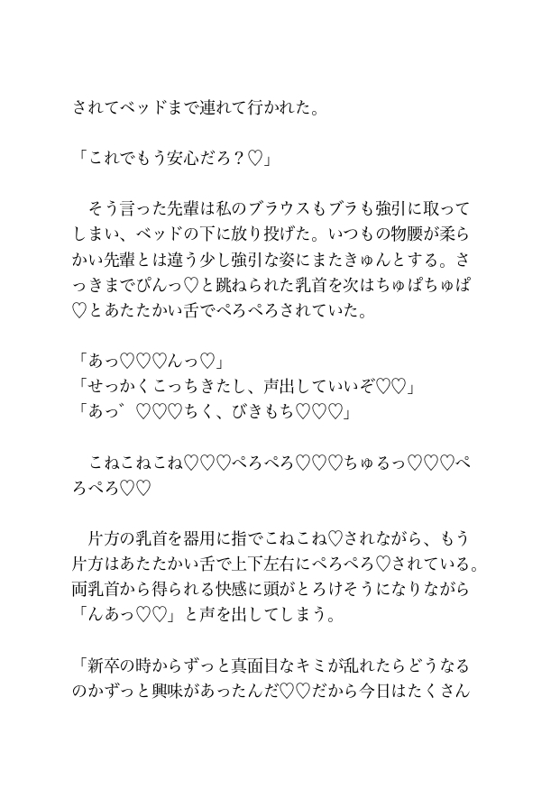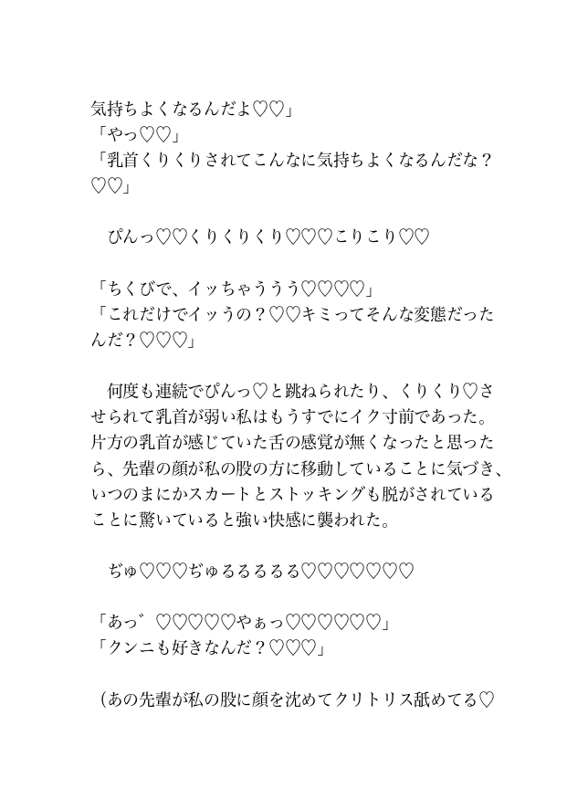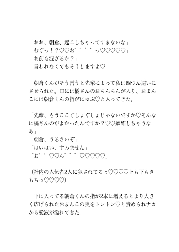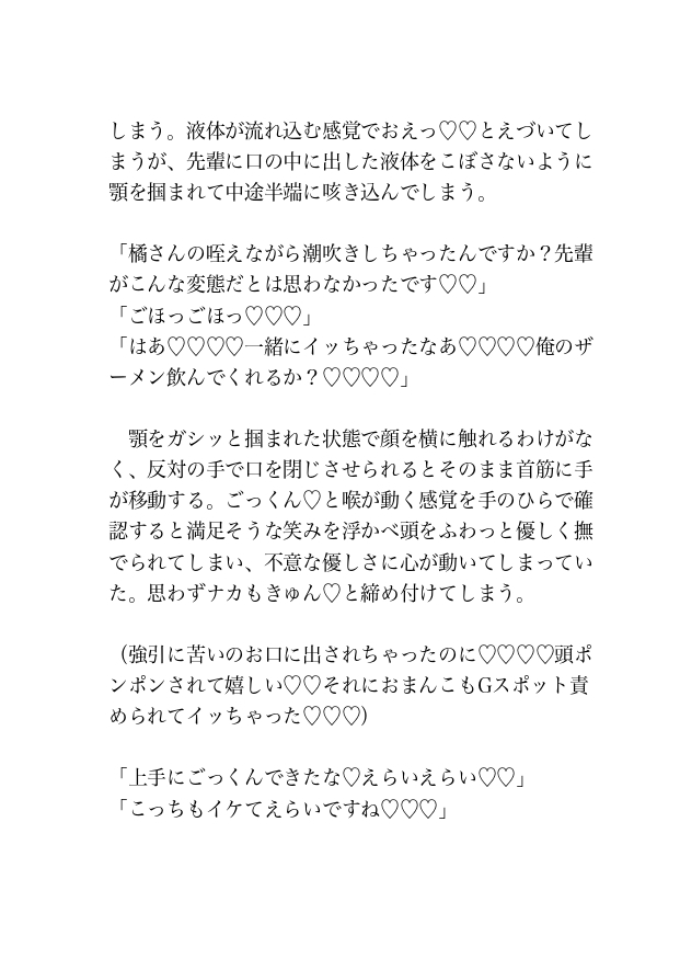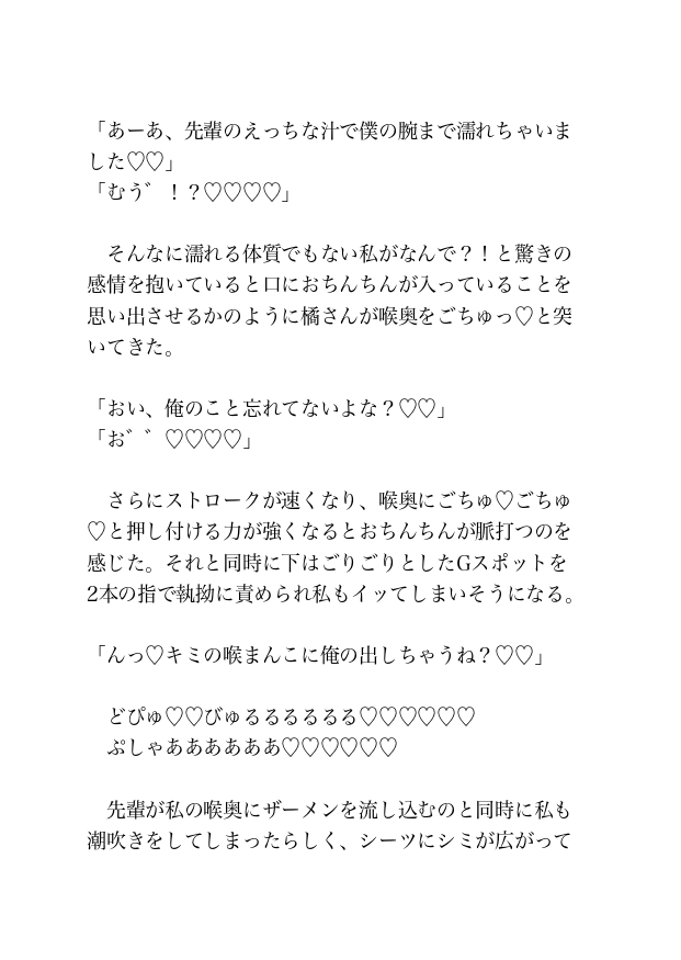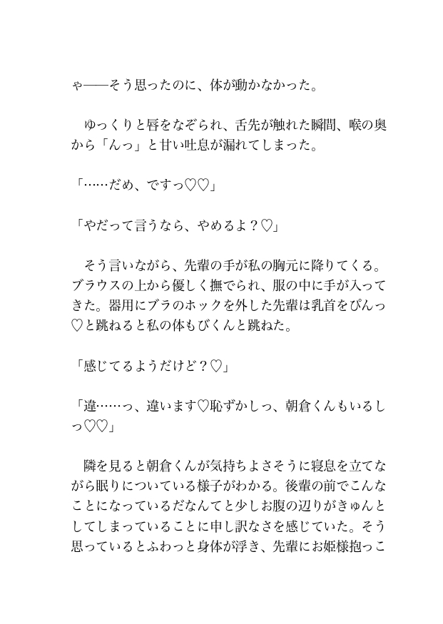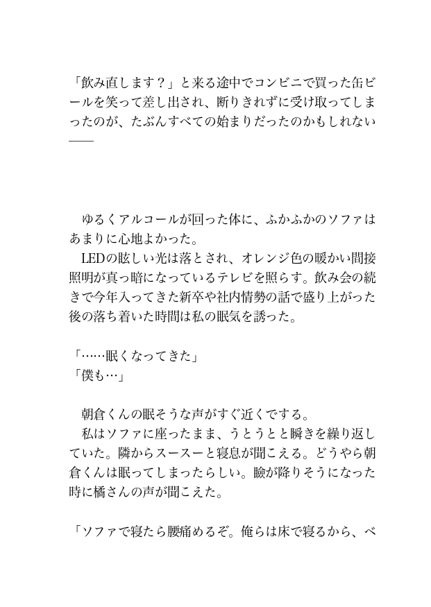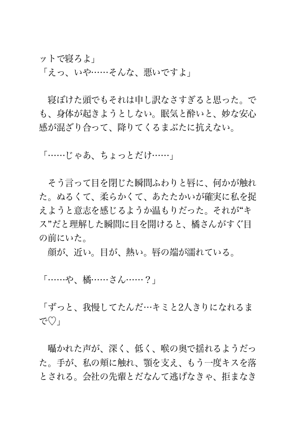 コンビニで買ったお酒を飲んでいると眠気が襲ってきたため、後輩の朝倉くんの隣で目を閉じると唇に何か当たる感触があり目を開けると先輩の橘さんの顔がすぐ目の前にあった。先輩からキスされていることを知った私はそのまま先輩を受け入れてしまう。