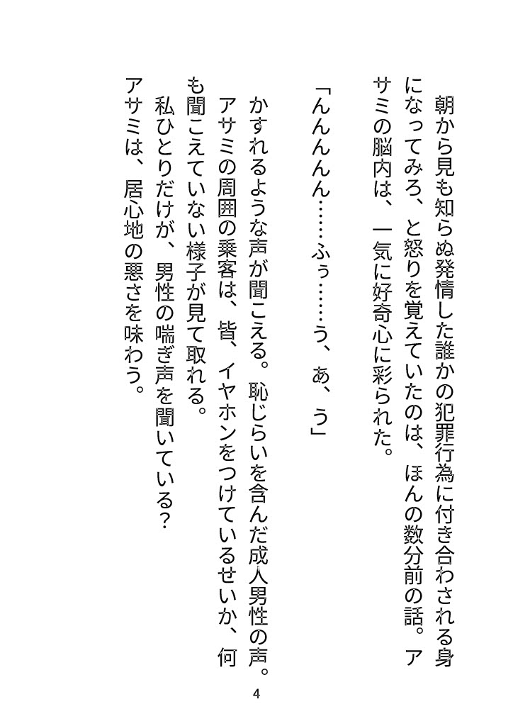 いつものように、ぎゅうぎゅう詰めの車内で男性の艶やかな喘ぎ声を耳にする。