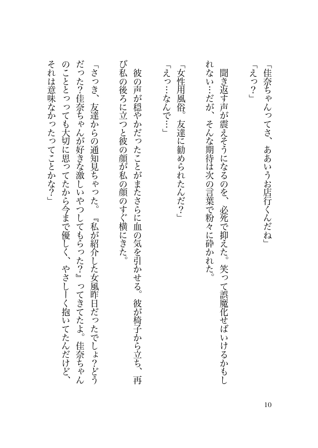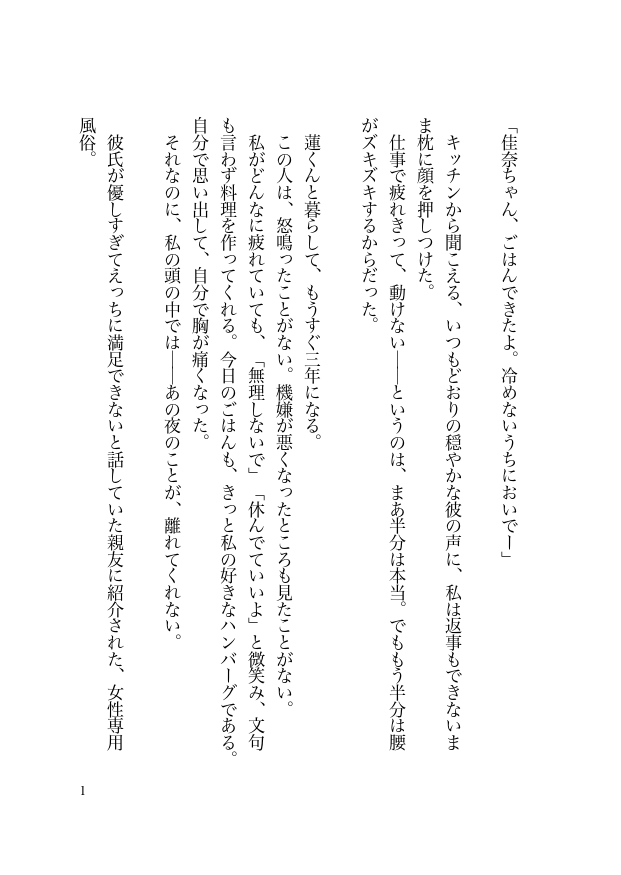 付き合って三年になる白崎蓮の優しいえっちに物足りなさを感じていた南佳奈は、激しいえっちがしたいと相談していた友達のすすめで女性用風俗を利用してしまう。