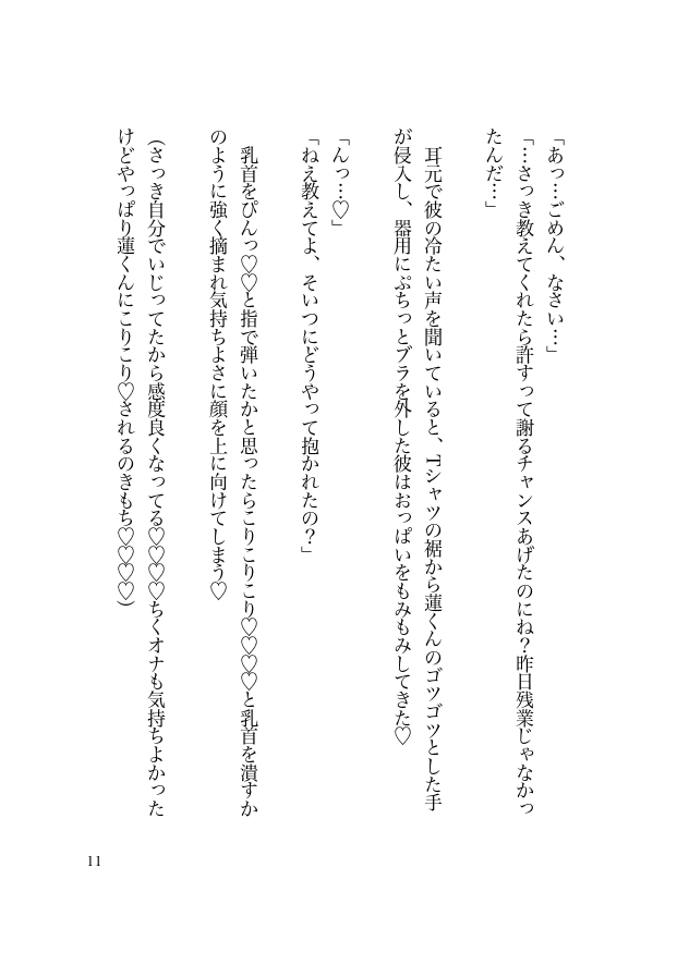 親切心から佳奈のスマホを充電しようとした蓮だが友達から佳奈に向けられたメッセージの通知を見てしまい、佳奈が女性用風俗に行ったことを知った蓮は佳奈に意地悪をしていく。
