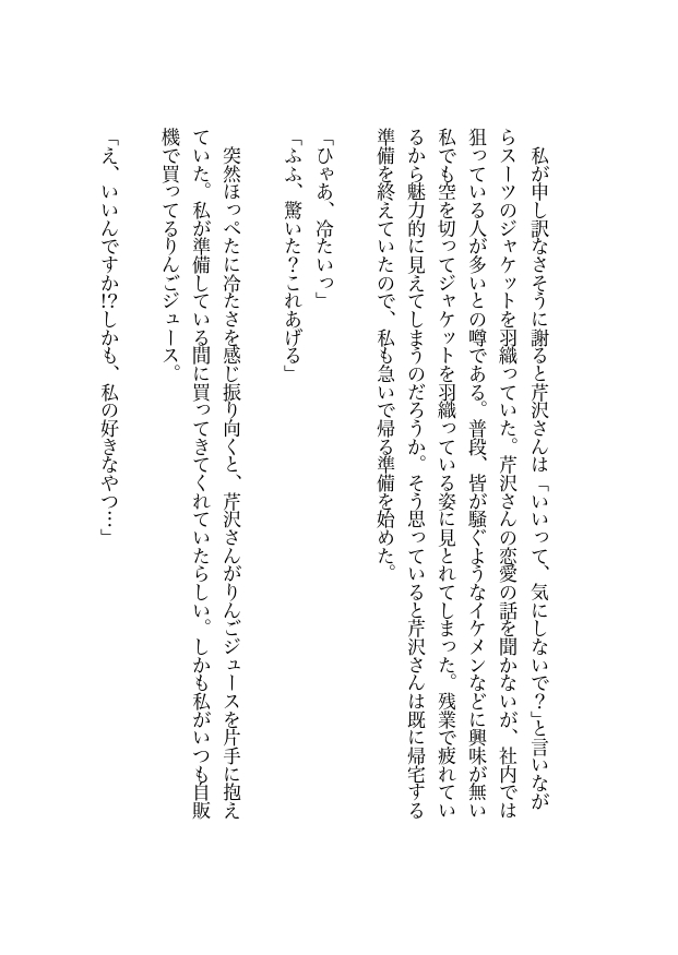 新卒で働いてきた会社にもようやく慣れ始めた桜井であったが、ある日大きなミスをしてしまい上司と残業することになった。終電間際にようやく仕事が終わると上司から好きな飲み物をもらい嬉しかったが「桜井のことはいつも見てるから」という一言に引っかかりを感じながら帰宅をする。