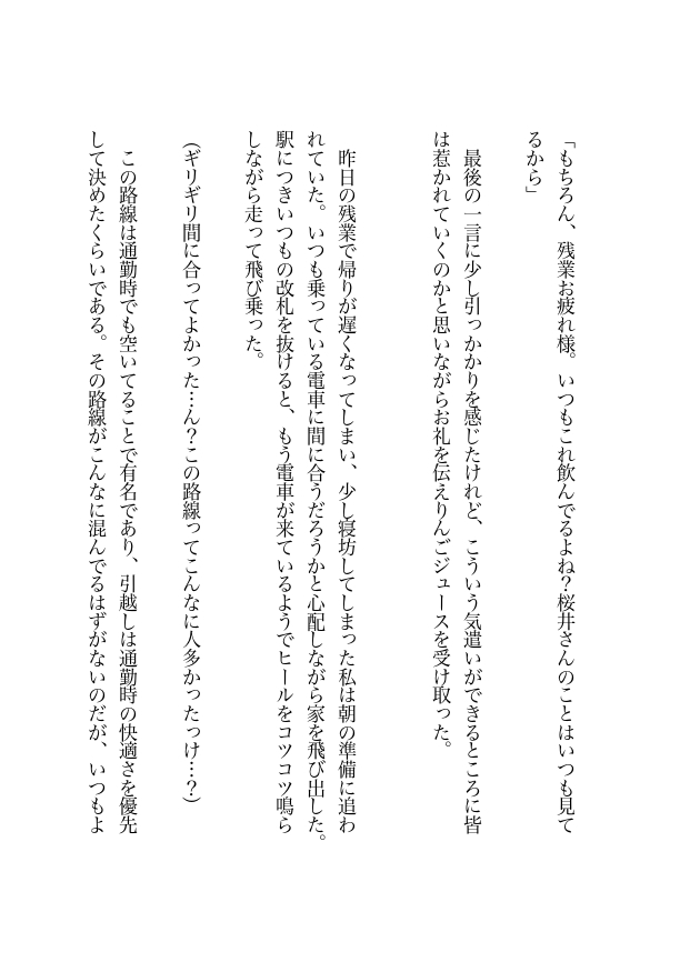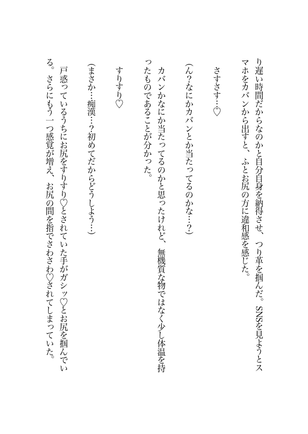 その次の日残業の影響で寝坊してしまい、いつもとは違う電車に乗るがその電車が痴○専用車両とは気づかずに飛び乗ってしまう。