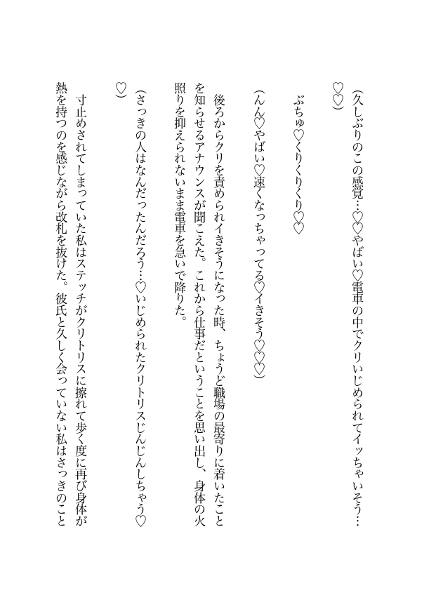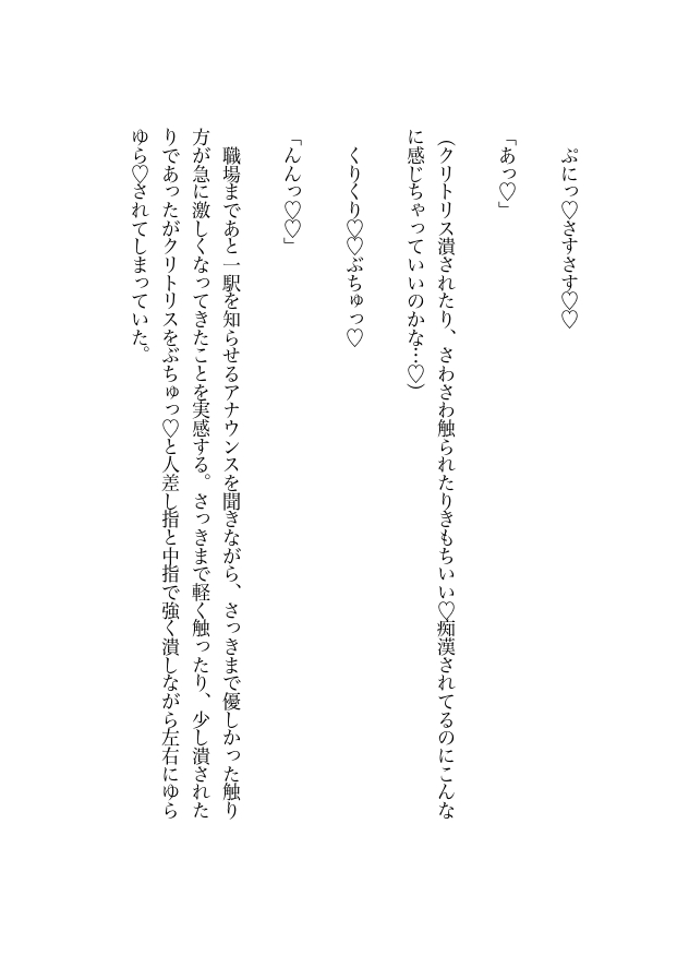 何も知らない私だったが朝からクリをいじめられてしまうイキそうになるが、会社の最寄りに到着したことを知らせるアナウンスが流れてしまい寸止め状態のまま電車を降りてしまった。