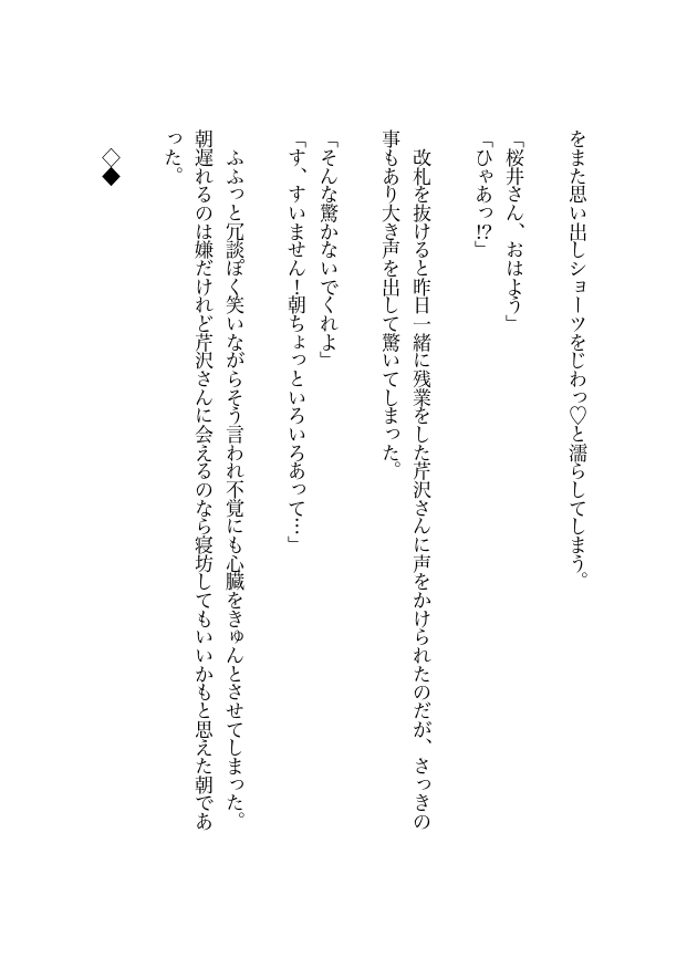 新卒の頃からの上司であり、いつも頼れる存在である。飲み会では芹沢の隣をキープしようと頑張っている人が多いけれども、芹沢の恋愛の話は誰も聞いたことがないため恋愛関係は謎である。いつも桜井のことを見ているという発言をしていたが...?内容:♡喘ぎ 痴○ クリ責め 乳首責め おもちゃ 顔射 潮吹きアクメ 中出し