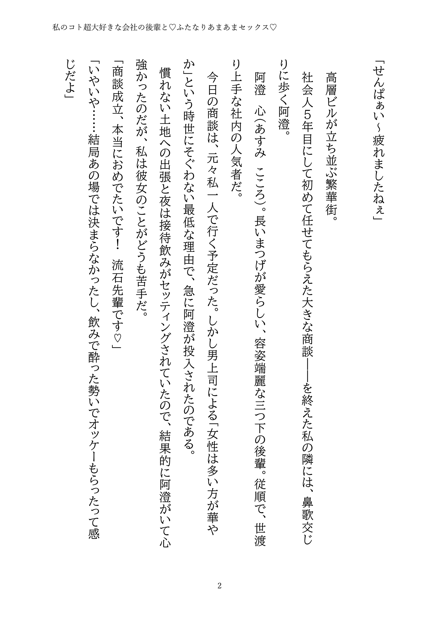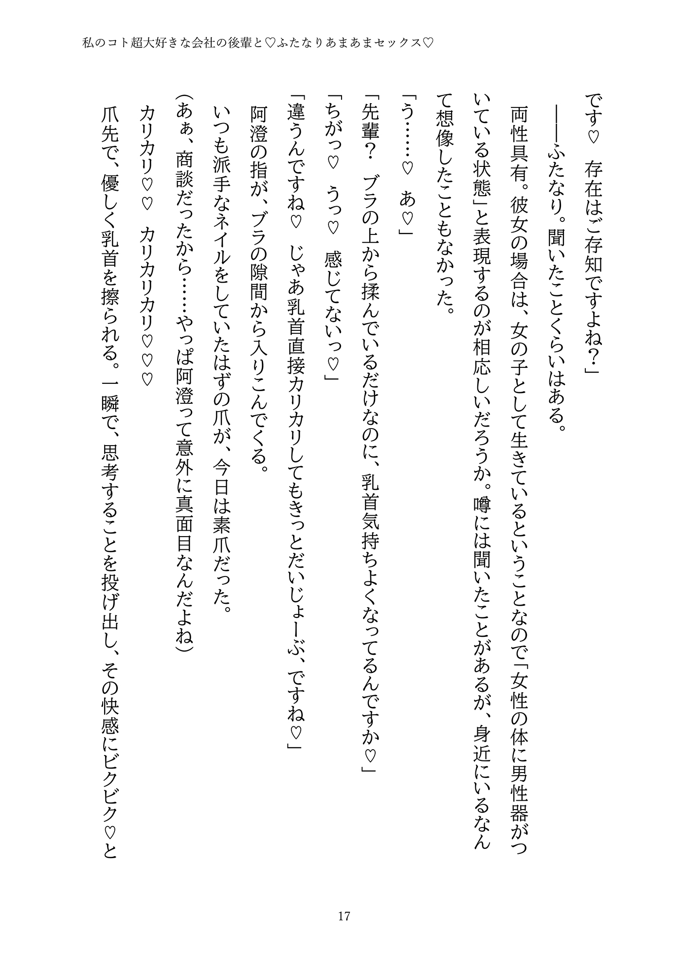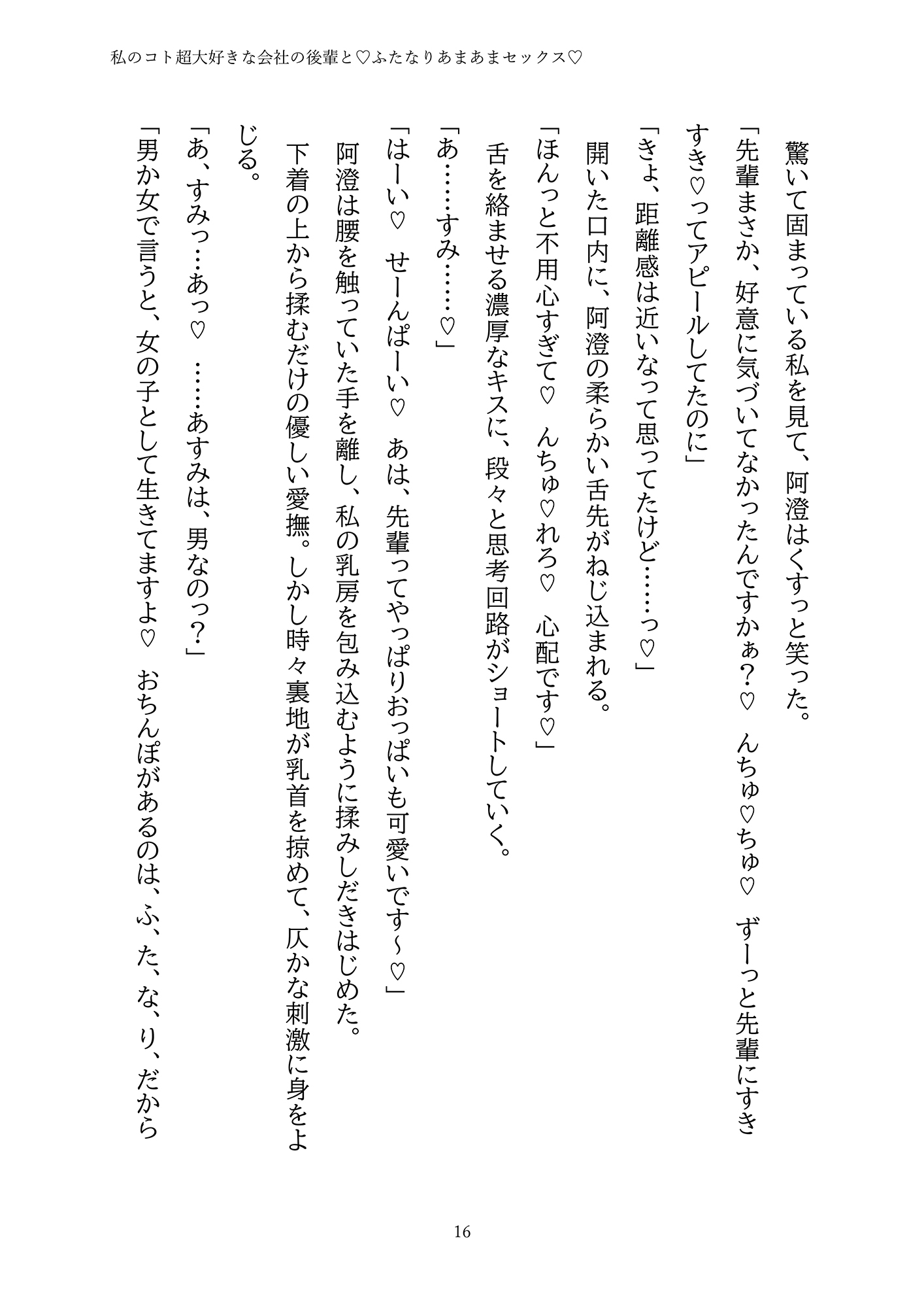 出張先のホテルで偶然知ってしまった事実。やたらと甘えてくる会社の後輩(♀)は、実はふたなりでした……⁉「好き」「可愛い」を連発するちょっぴり強引な後輩との『ふた×女』えっちで甘々に溶かされちゃう♡