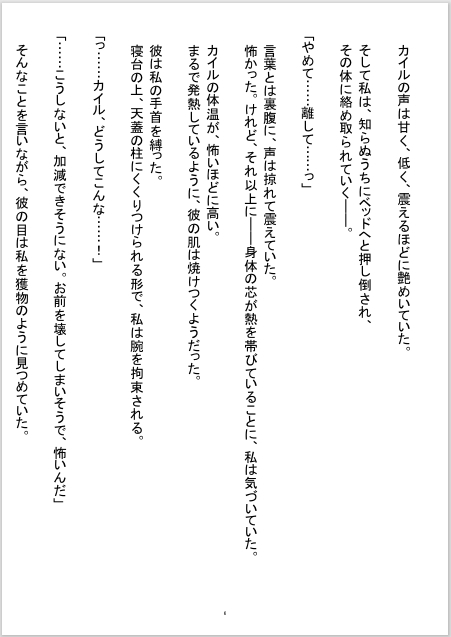 発情した彼はまるで獣。牙をむき、唇を噛み、彼女の肌を這い回りながら「こんなに甘い姫を他の男に渡せるわけがない」と囁く。