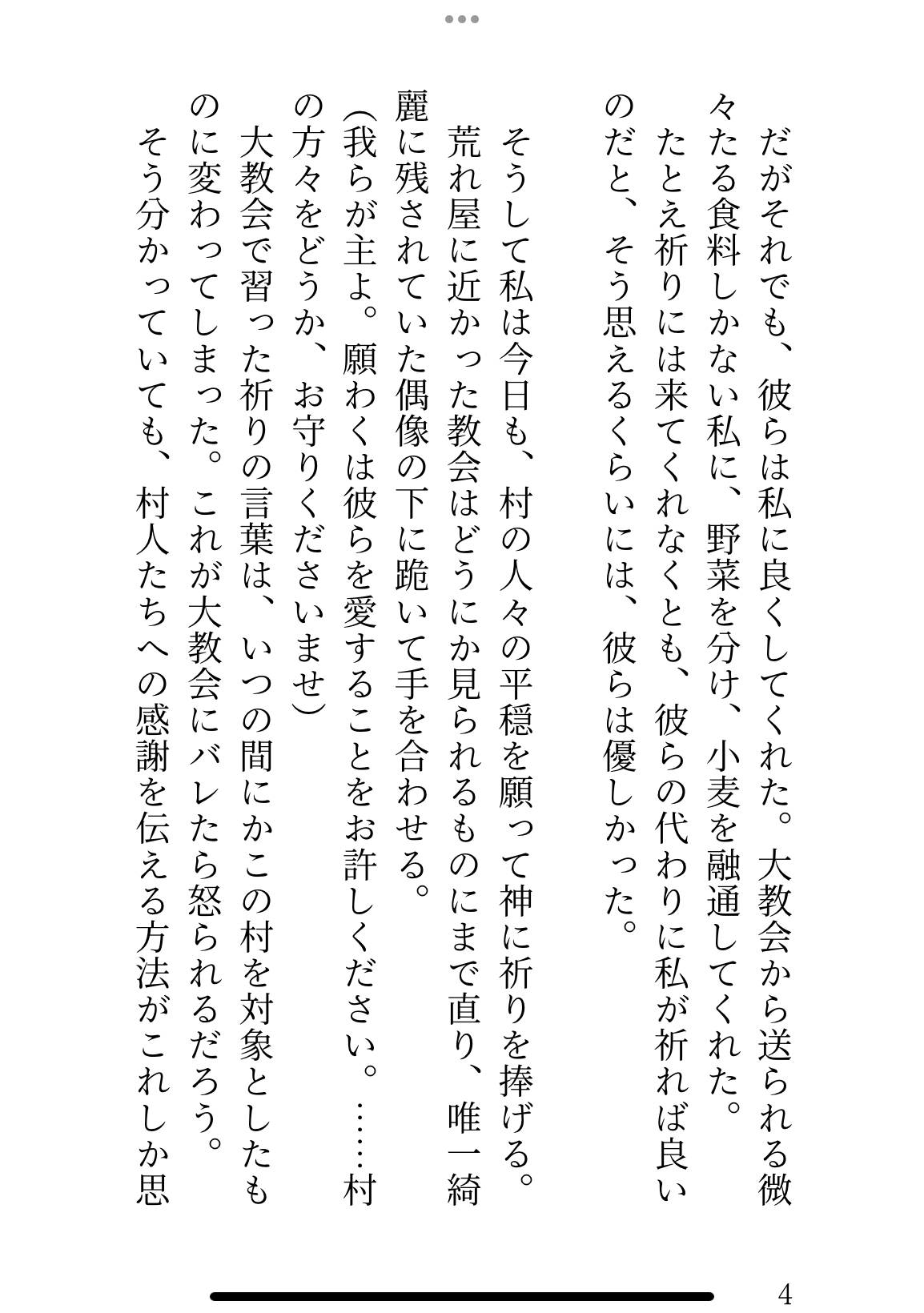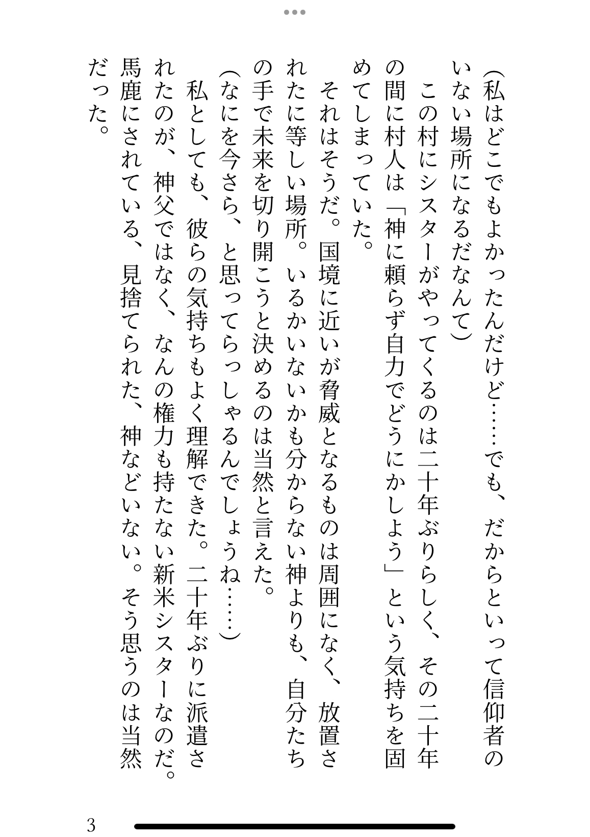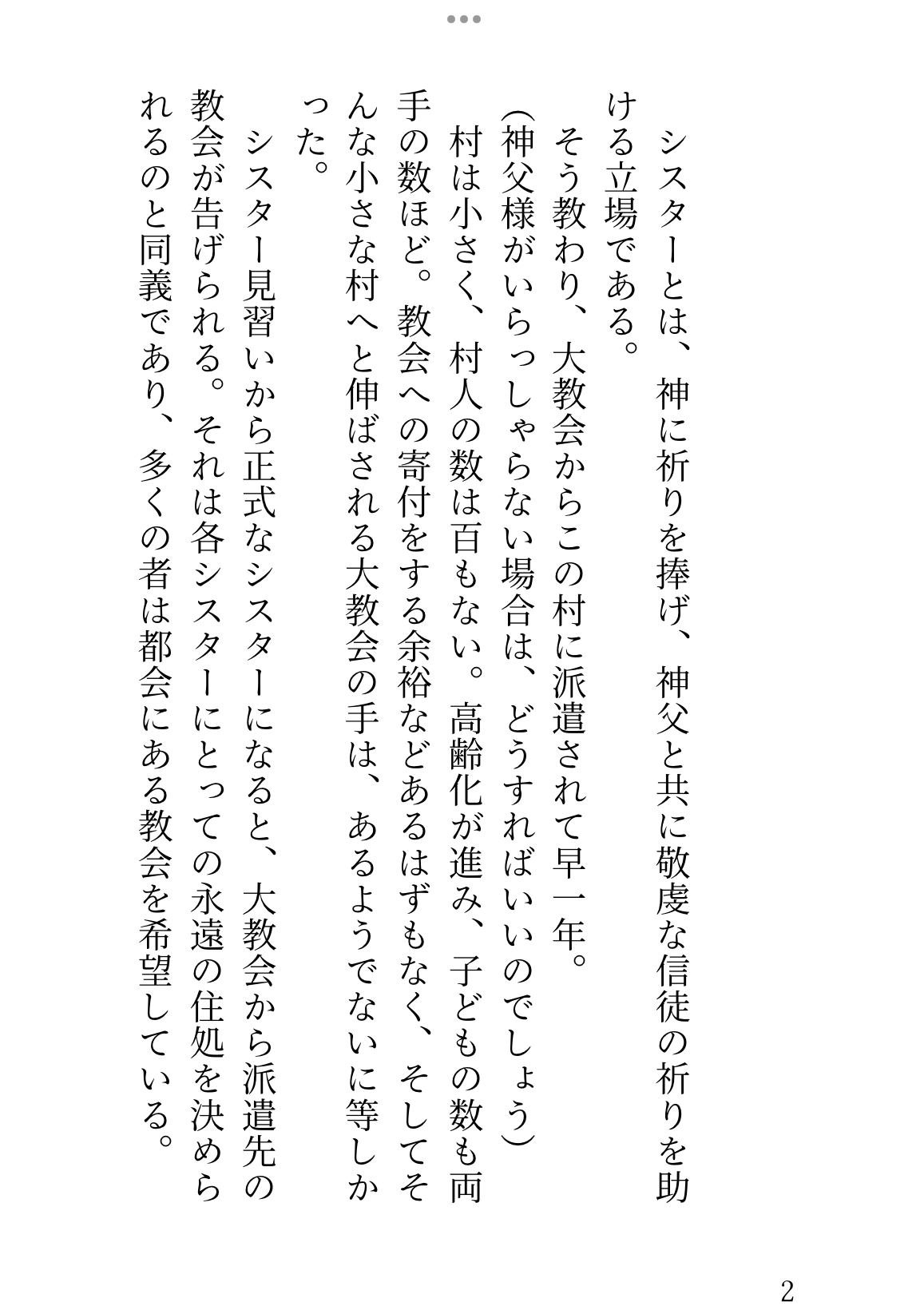 とある村で1人シスターを務めている貴女。信仰者がいなくとも、ただ1人祈りを捧げ続けていたところに、男性がやってくる。