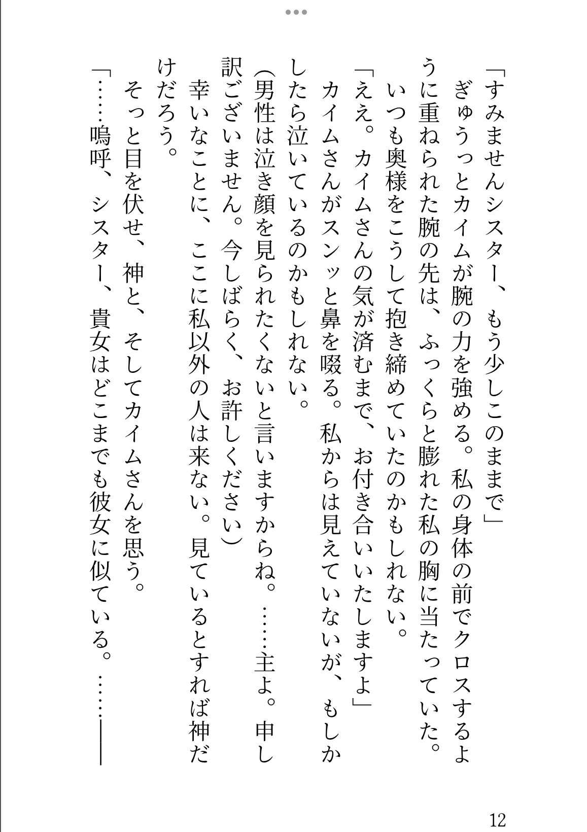 力強い腕はカイムのもので、慌てるシスターにカイムは「すみません…妻を思い出してしまって。少しだけ、このままでもいいですか」と悲嘆に暮れた声で願う。