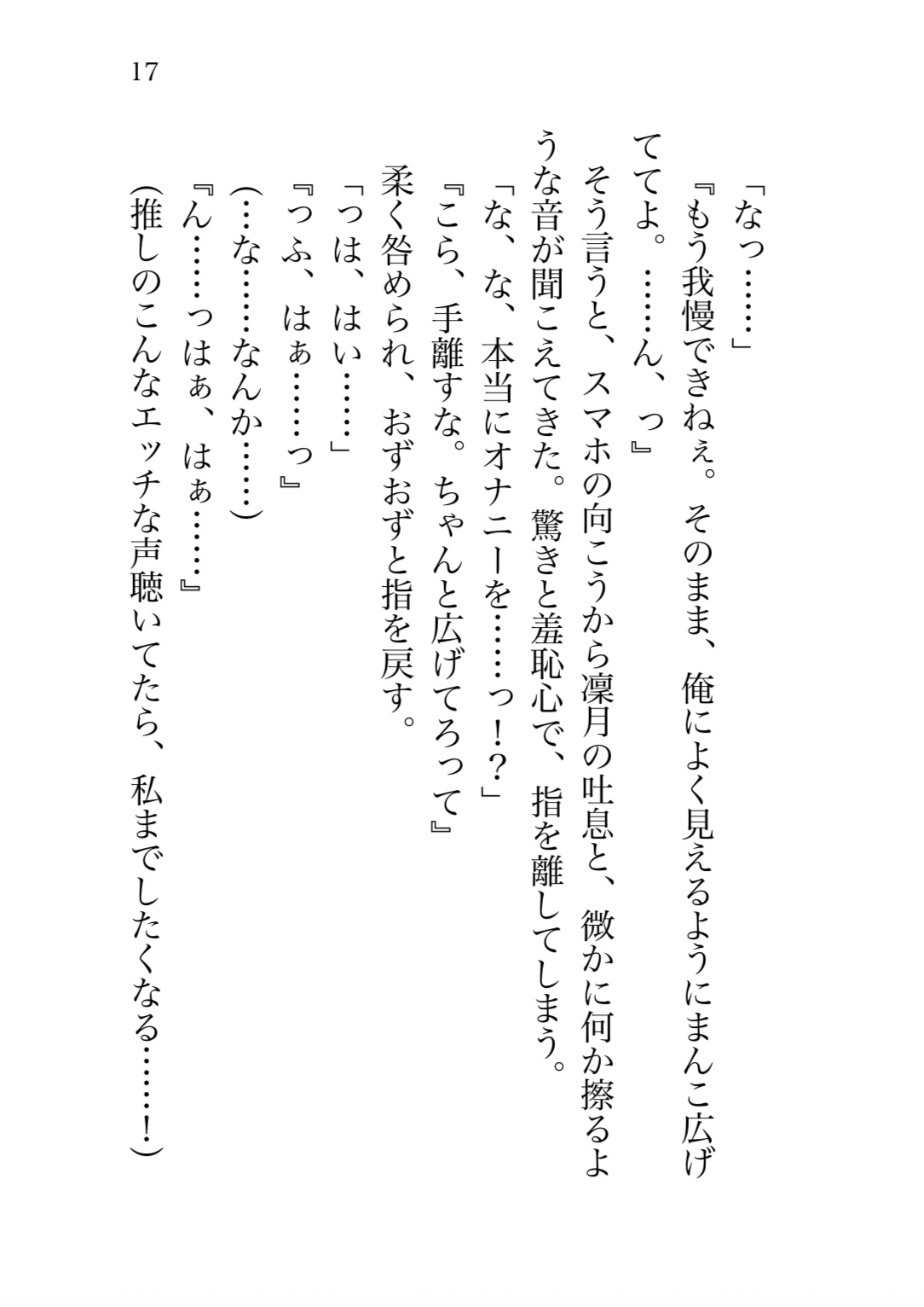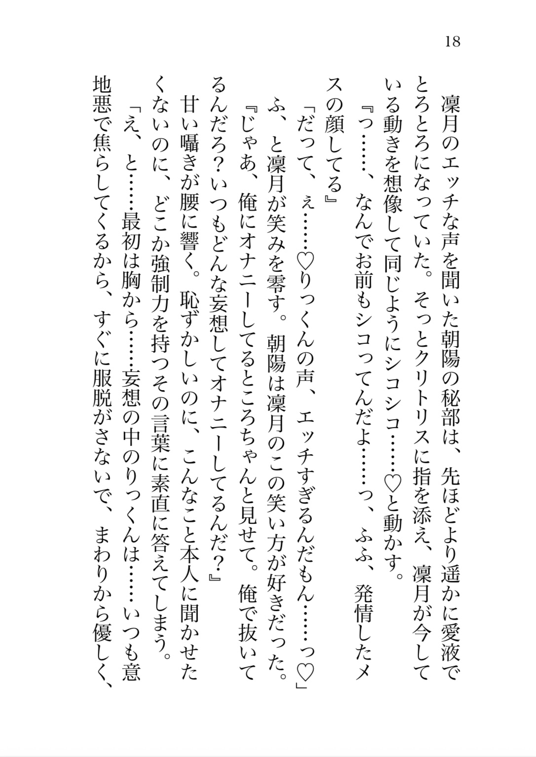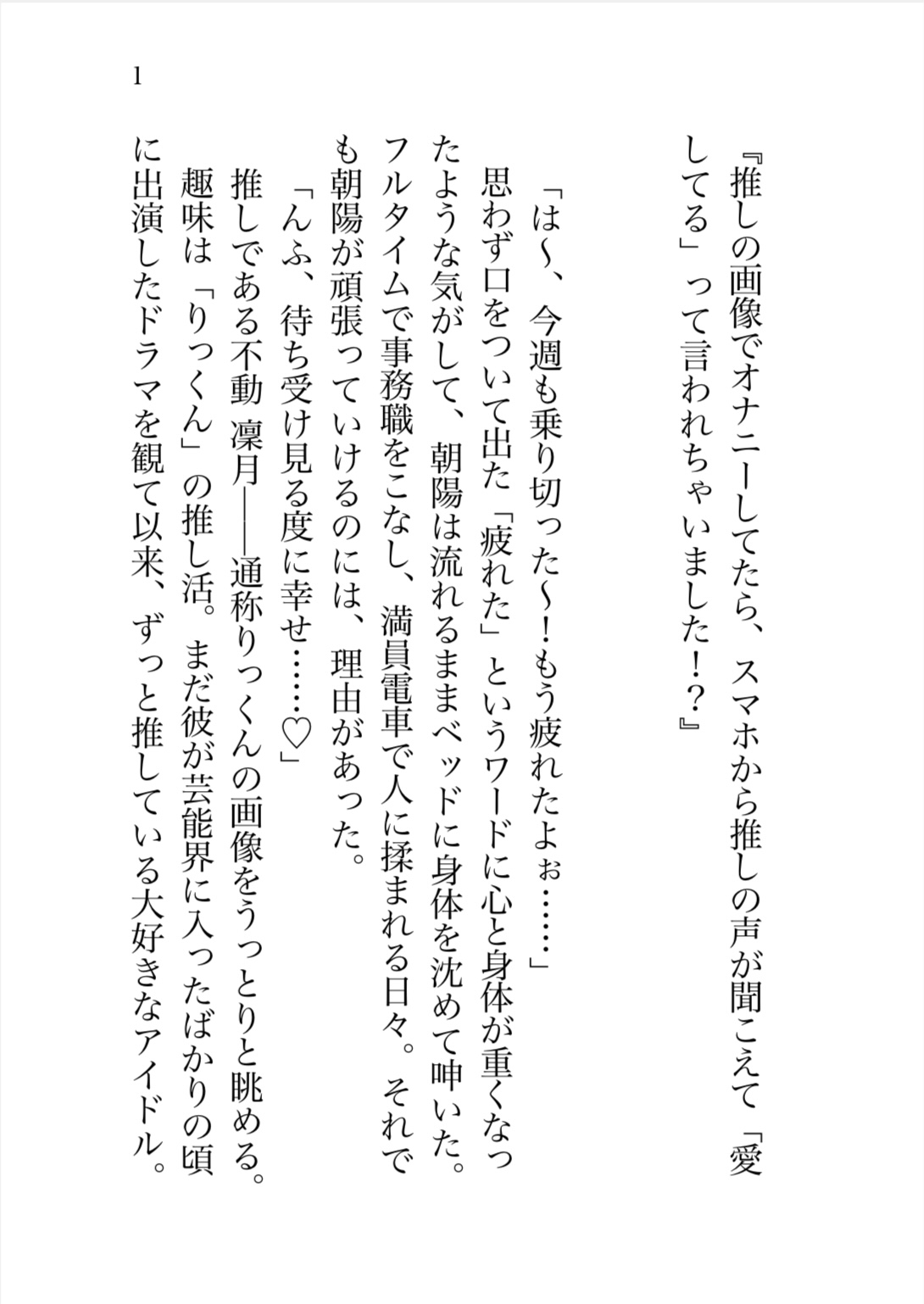 約24000字/88ページ□春日 朝陽(かすが あさひ):27歳のOL。妄想癖があり、いつも推しの画像や自作裏夢小説を読んではオナニーをしている。凜月がデビューする前からの古参ファン。テレビで凜月を見かけてその笑顔に恋に落ちる。たまに見せるSっぽさにハマり、その妄想を膨らませている。