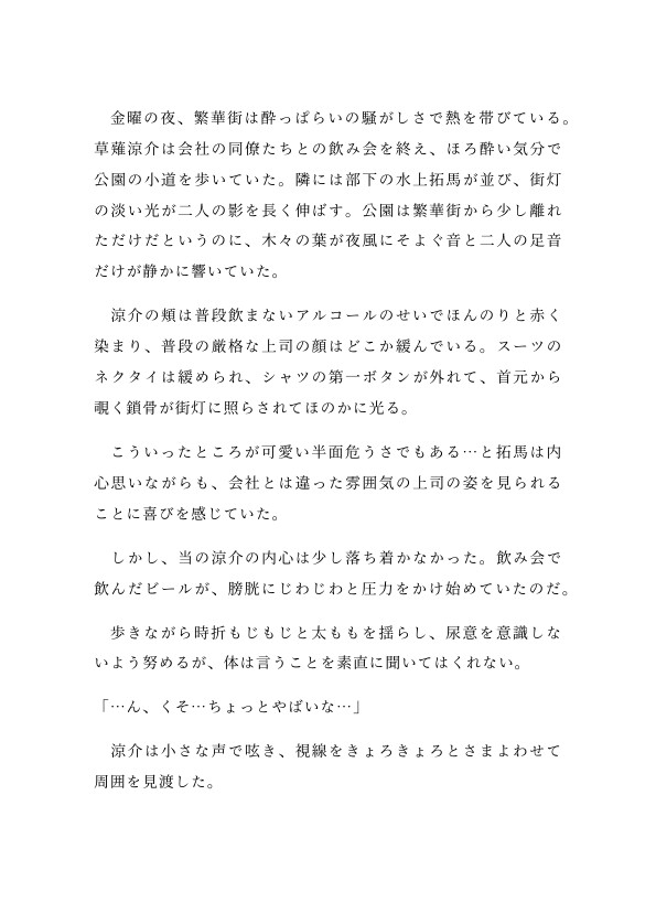 ジャンル:淫語 / サラリーマン / 屋外 / おもらし / ボーイズラブ / 青姦 / 中出し / 放尿/おしっこ /