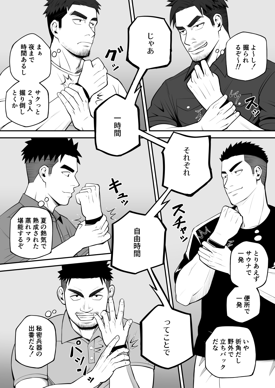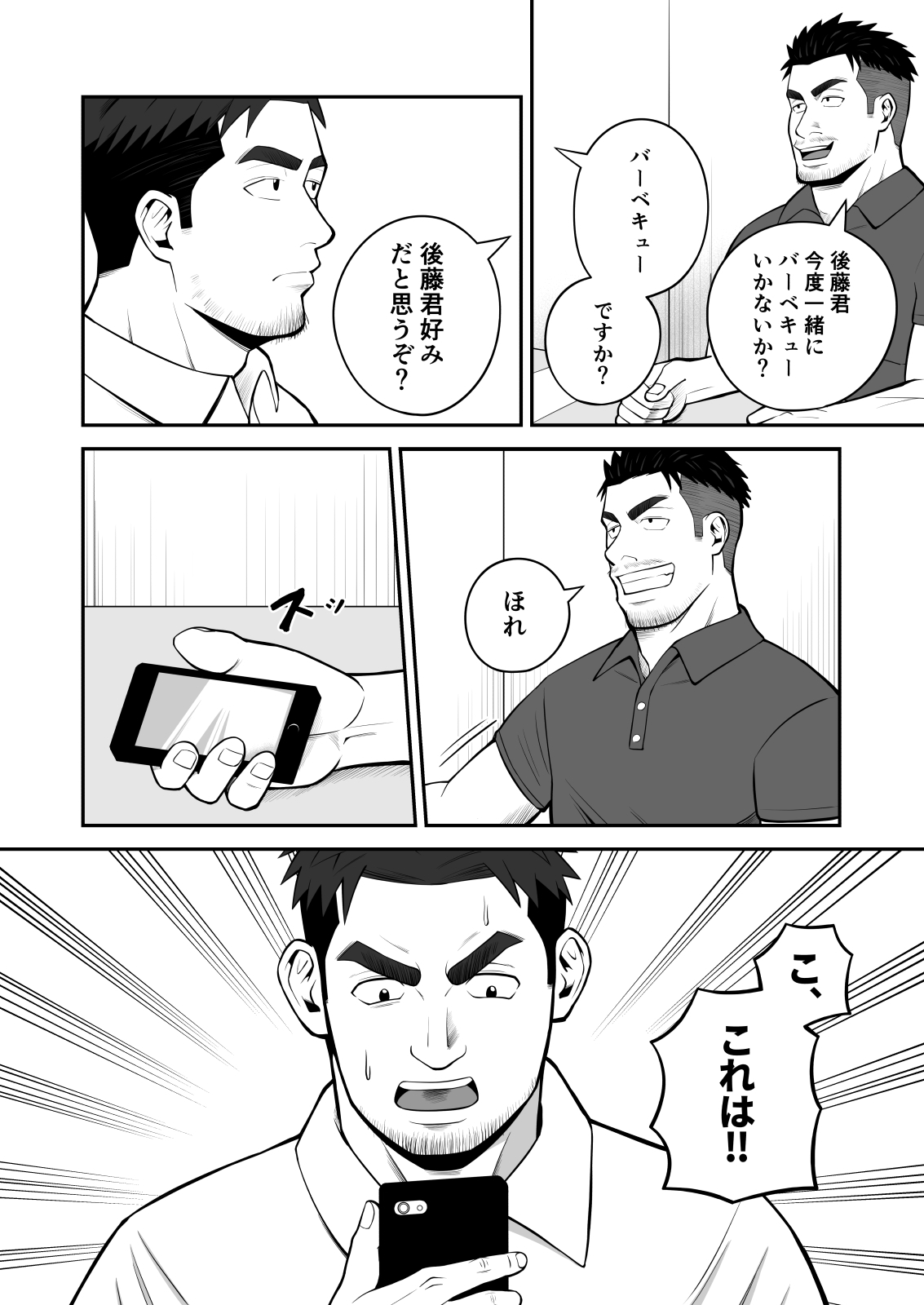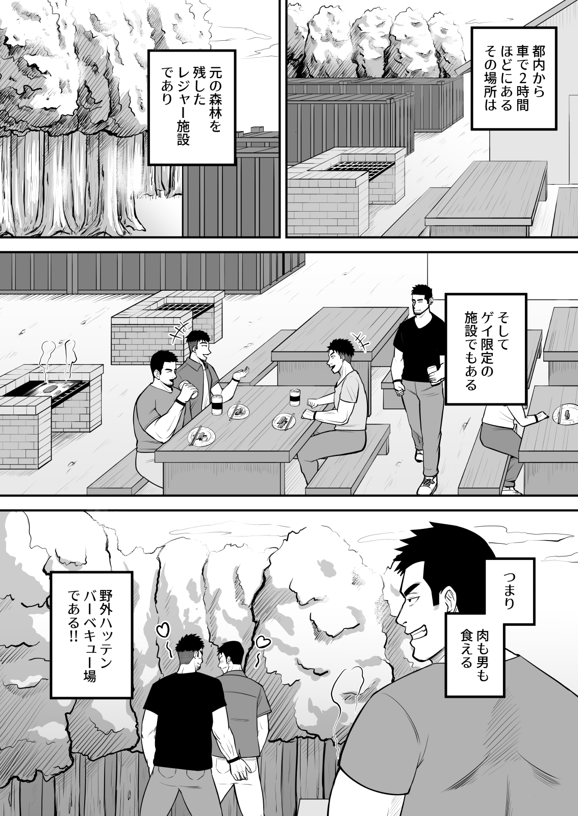 打合せに来た松田にバーベキューに誘われる後藤 そこはなんと肉も男も食える野外ハッテンバーベキュー場であった そして即決で行く事を決める後藤であった